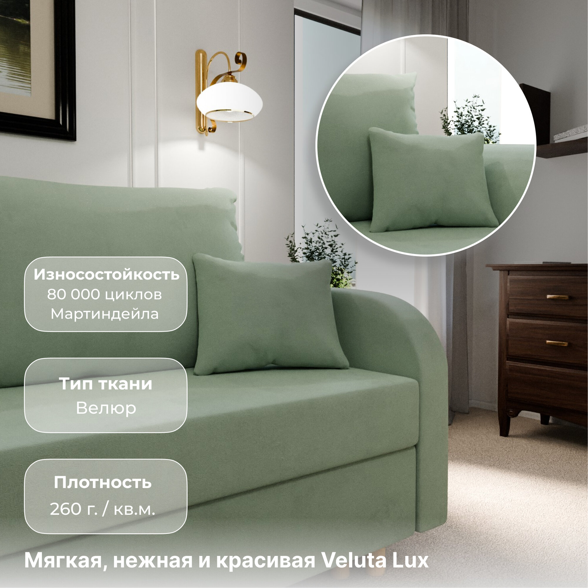 Диван раскладной, "Valensia", НПБ, Велютта люкс 42 размеры 220х80х100, светло-зеленый