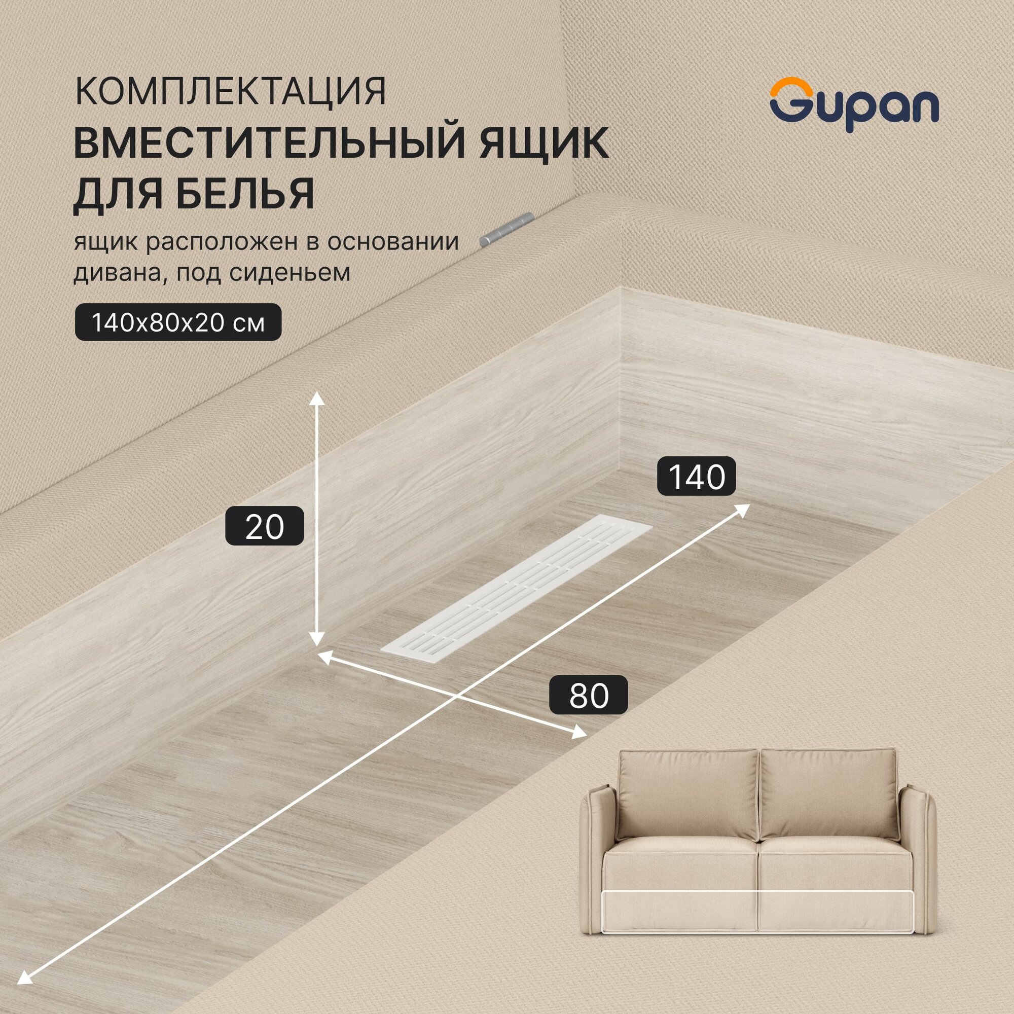Диван кровать Gupan Кафф 1 / Смайл Рогожка Бежевая, раскладной, механизм аккордеон, беспружинный, с ящиком для белья