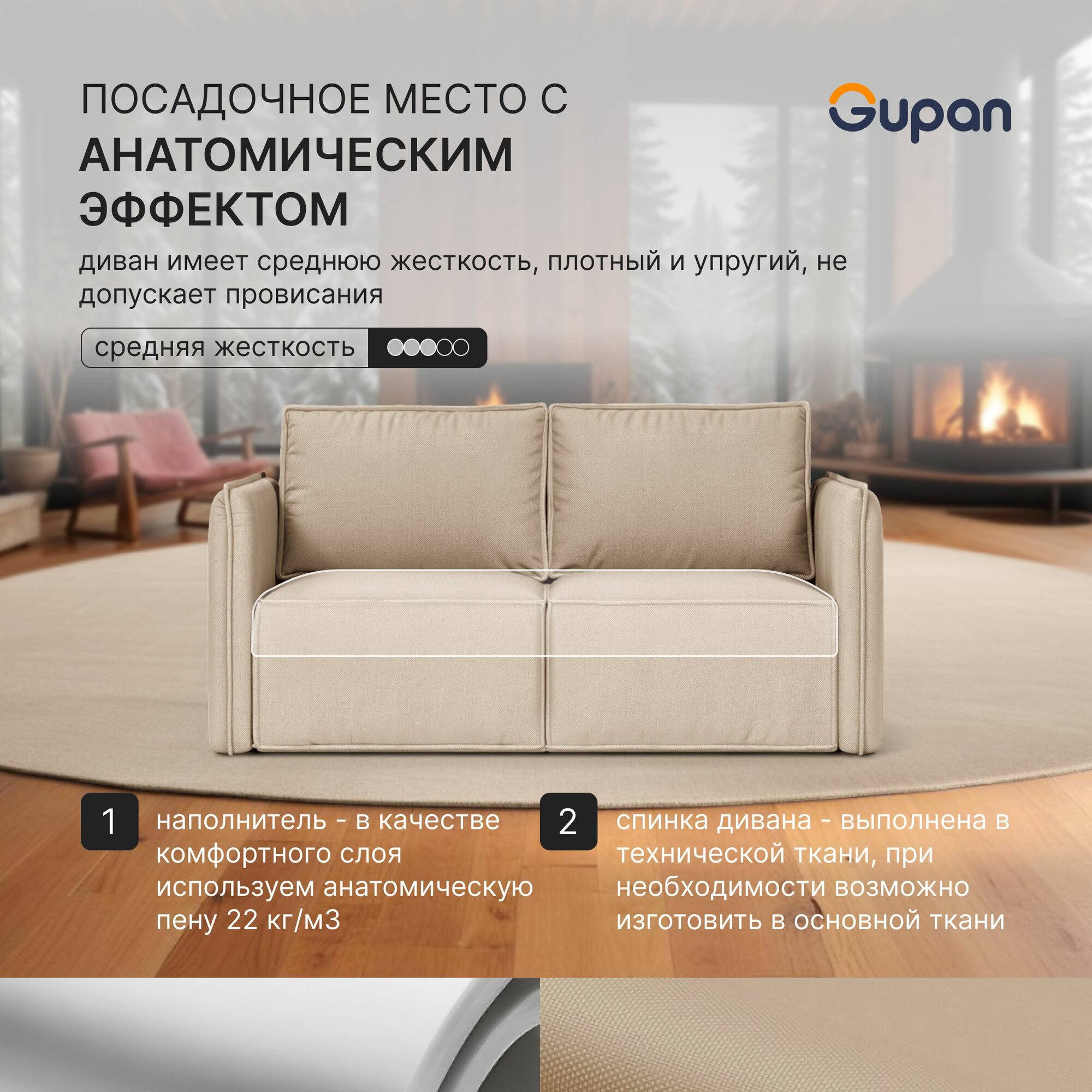 Диван кровать Gupan Кафф 1 / Смайл Рогожка Savana Latte, раскладной, механизм аккордеон, беспружинный, с ящиком для белья