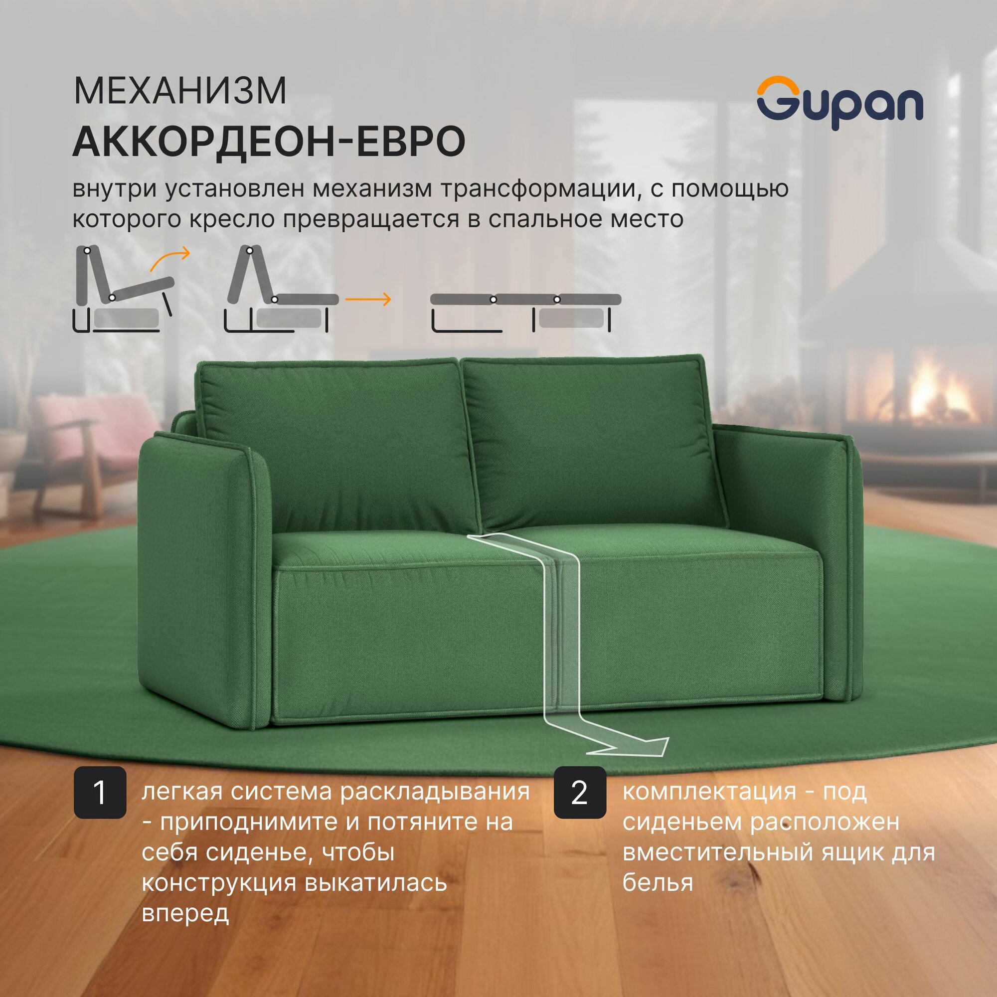 Купить Диван кровать Gupan Кафф 1 / Смайл Велюр Amigo Green, раскладной, механизм аккордеон, беспружинный, с ящиком для белья