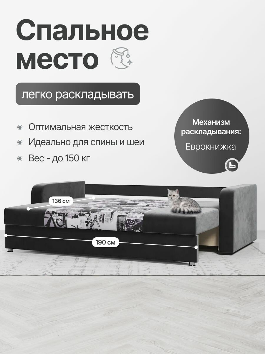 Диван раскладной прямой, 215х95х77, еврокнижка, велюр, серый принт Москва, Леон