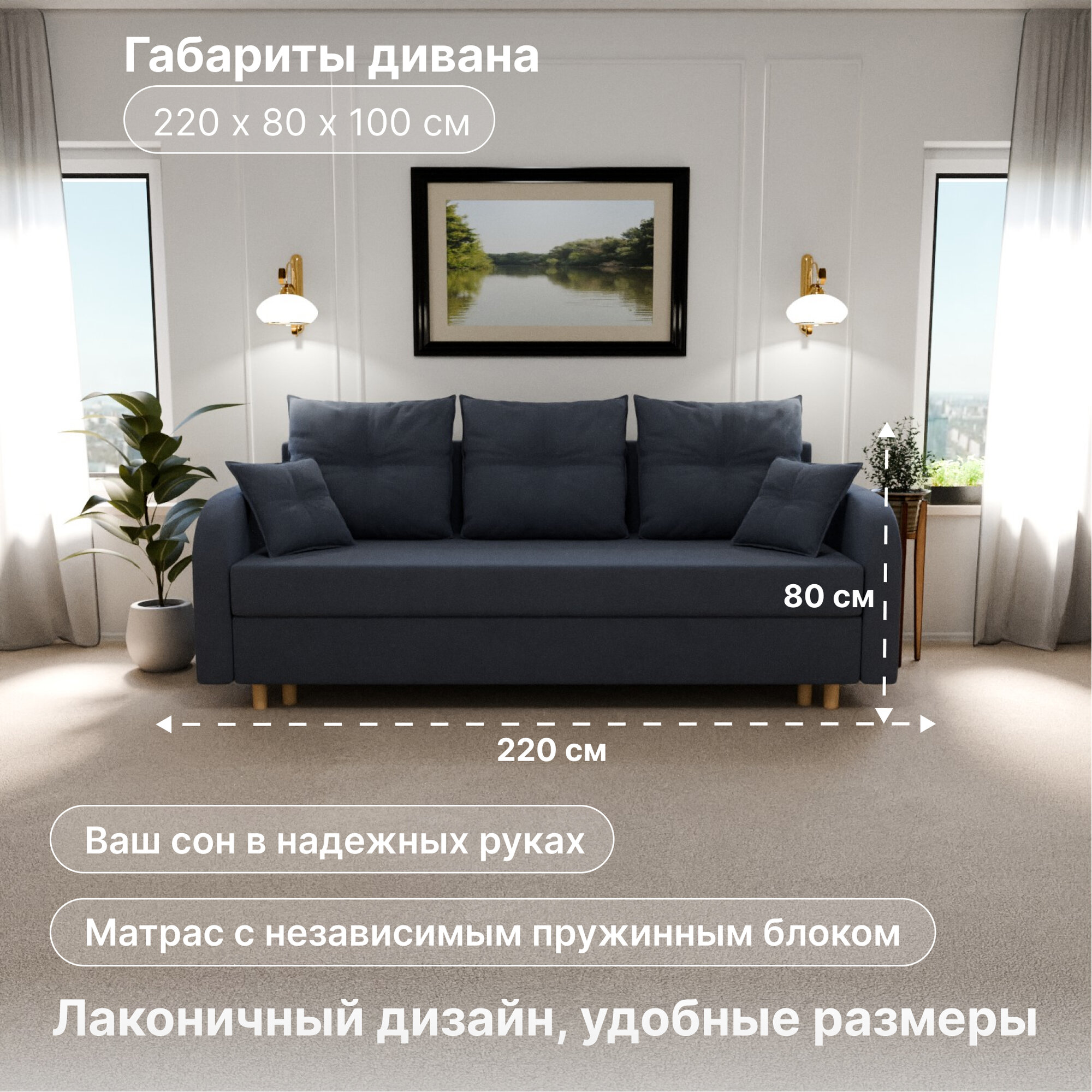 Диван, диван-кровать, диван раскладной "Генри" НПБ, Велютта люкс 26, размеры 220х80х100, синий