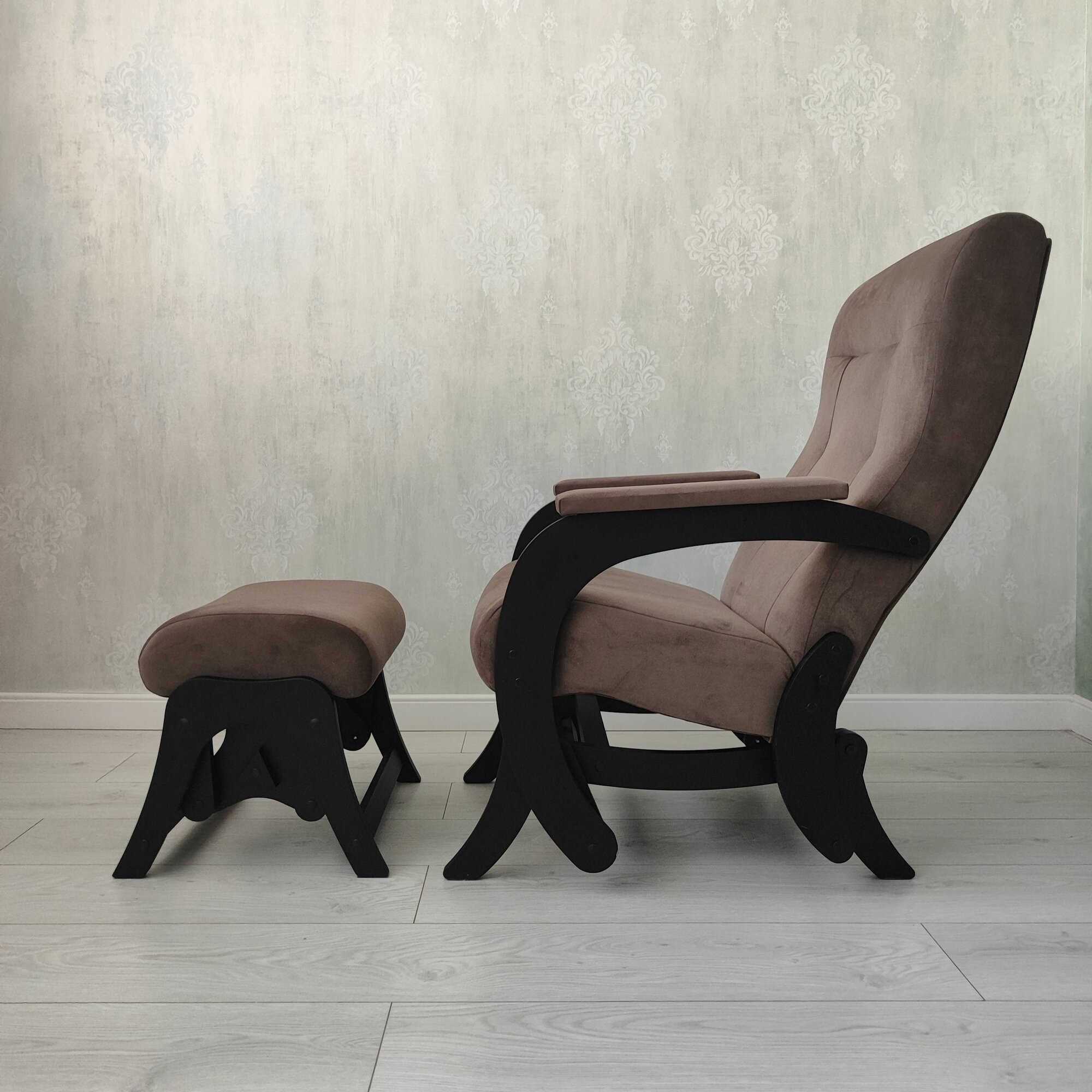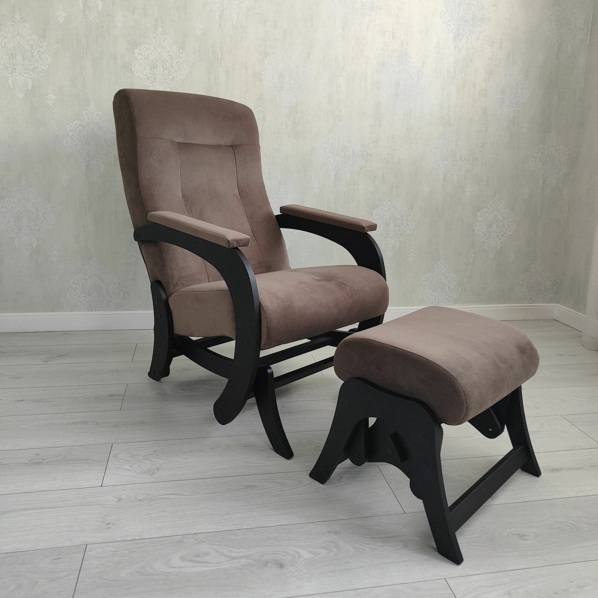 Кресло качалка с пуфом комплект Гранд, ткань велюр, маятниковый механизм, бежевый/венге
