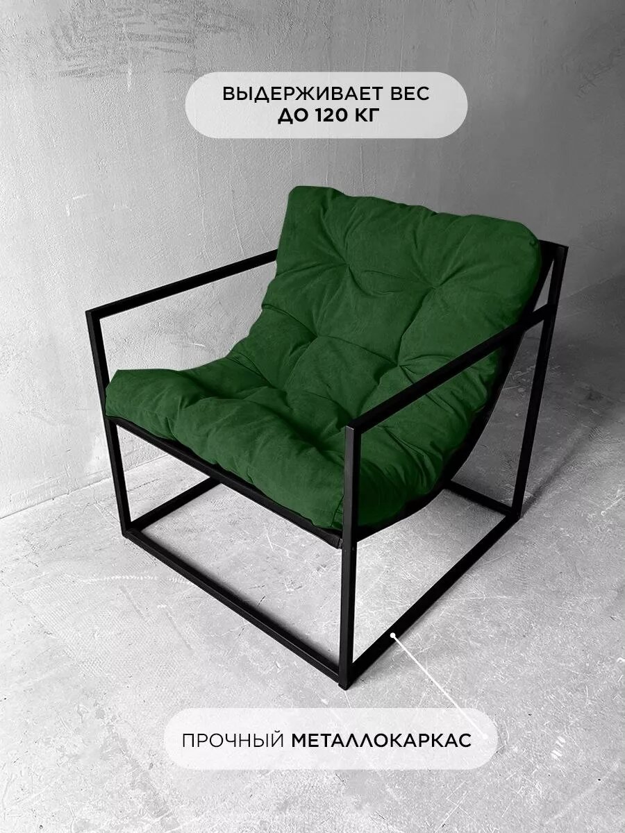 СохранитьКресло мягкое удобное для отдыха, уличное, на балкон, веранду, в стиле лофт, минимализм, Комфи + велюр зеленый интересное: