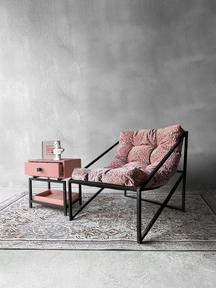 СохранитьКресло мягкое удобное для отдыха, уличное, на балкон, на веранду, в стиле лофт, минимализм, Слэш + велюр розовый леопард интересное: