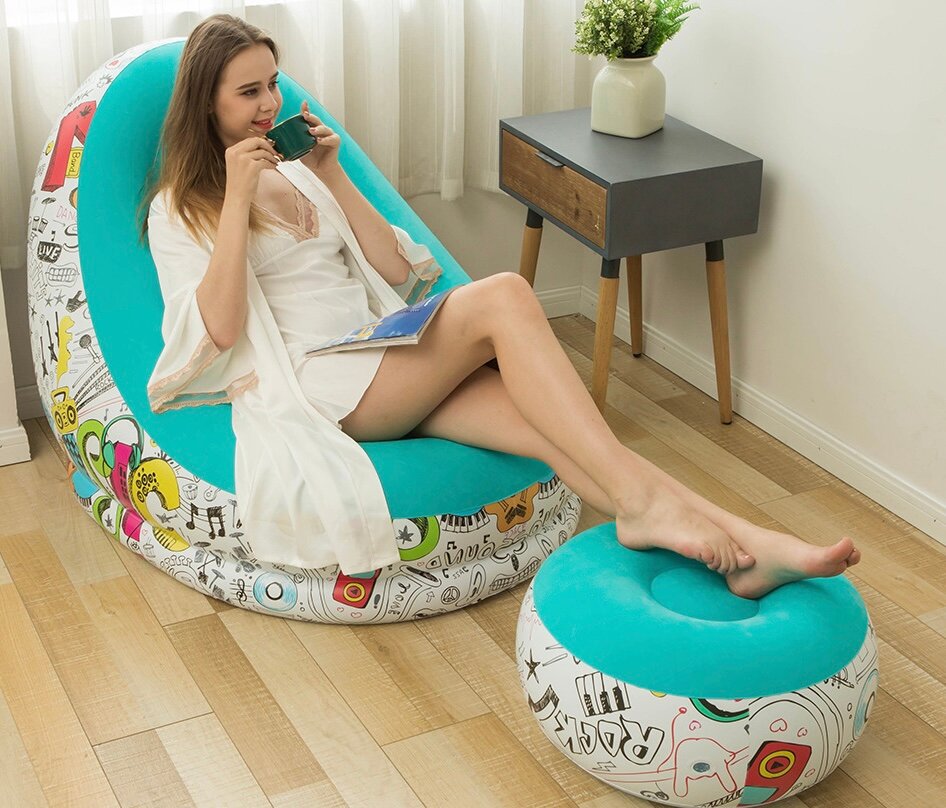Купить Надувное универсальное кресло с насосом, для дома и дачи, голубой с граффити, 116x98x83 см