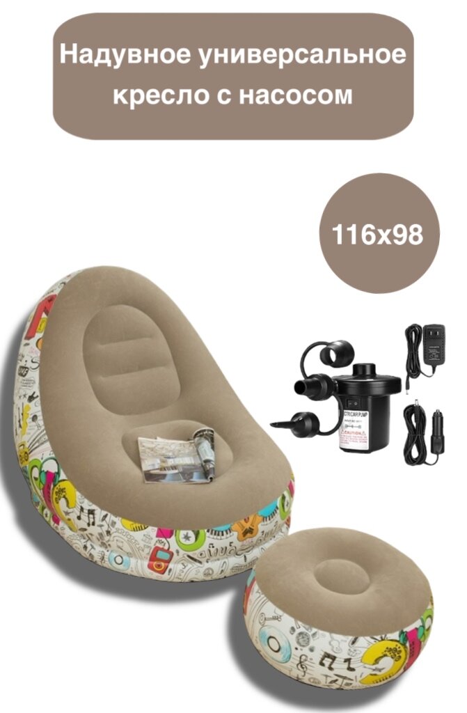 Ниже Вы можете прочитать отзывы на Надувное универсальное кресло с насосом, для дома и дачи, бежевое с граффити, 116x98x83 см, ознакомится с подробными характеристиками, посмотреть интересные обзоры и фотографии на Надувное универсальное кресло с насосом, для дома и дачи, бежевое с граффити, 116x98x83 см.