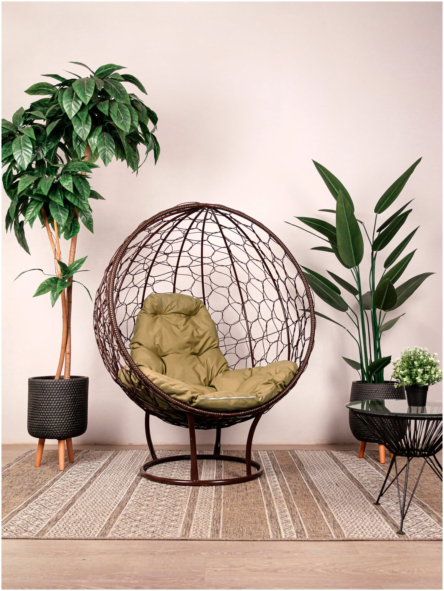 Кресло m-group круг на подставке с ротангом коричневое, бежевая подушка интересное: