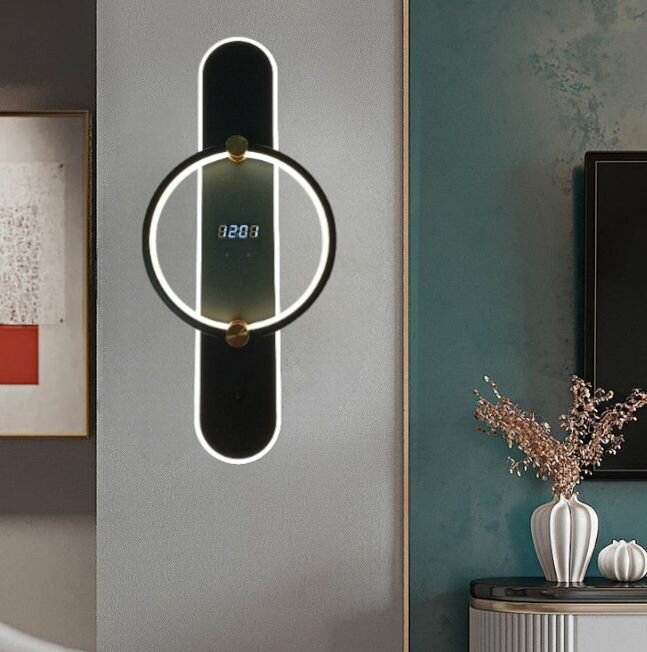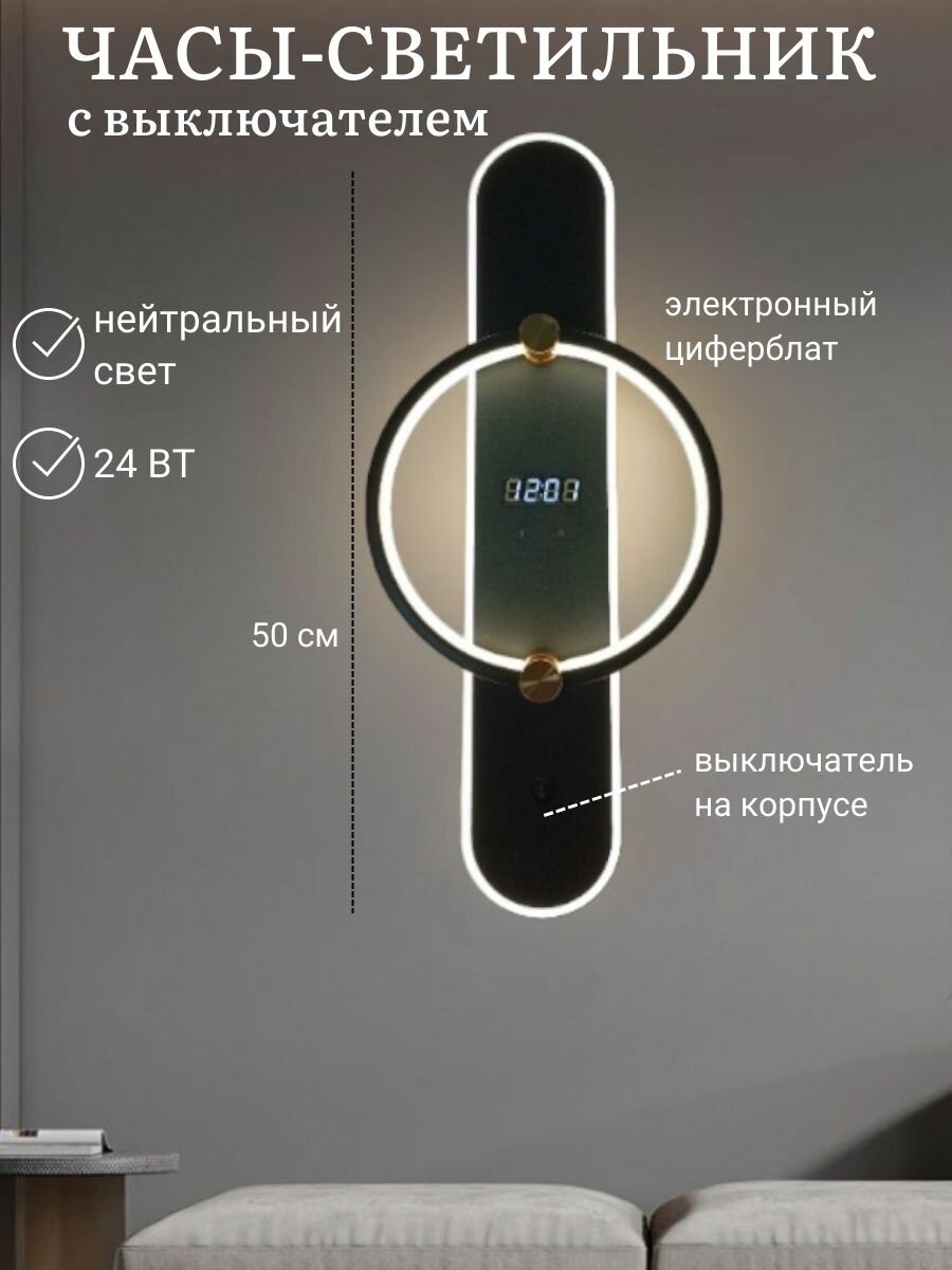 Купить Бра настенный светодиодный с часами и выключателем Светильник кольцо на планке из алюминия 50 см Черный Нейтральный