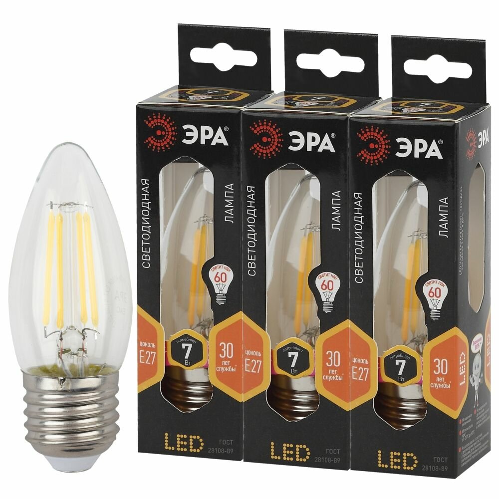 Набор светодиодных лампочек ЭРА F-LED B35-7W-827-E27 2700K свеча 7 Вт 3 штуки интересное: