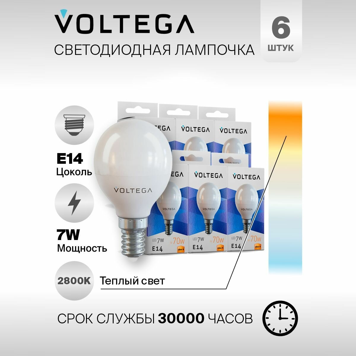 Купить Лампочка светодиодная E14 форма шар 7W теплый свет Voltega Simple Globe 2800K упаковка 6 штук