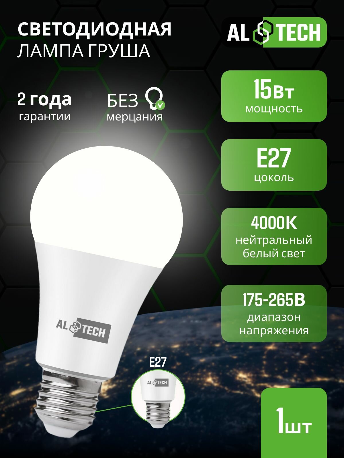 Купить Лампочка светодиодная E27 4000K 15 Вт (аналог 120 Вт) нейтральный белый свет AL TECH, груша, 1 шт