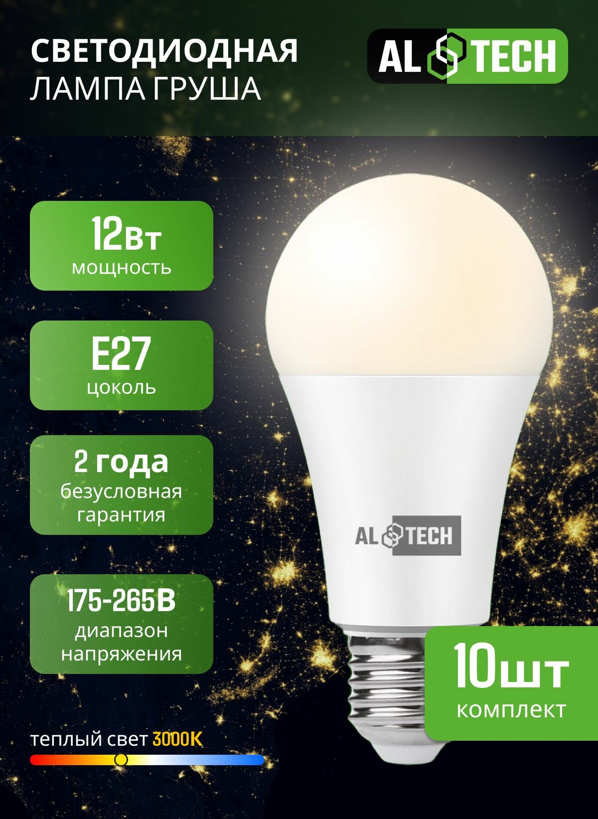 Купить Лампочка светодиодная E27 3000K 12 Вт (аналог 100 Вт) теплый свет AL TECH, груша, упаковка 10шт