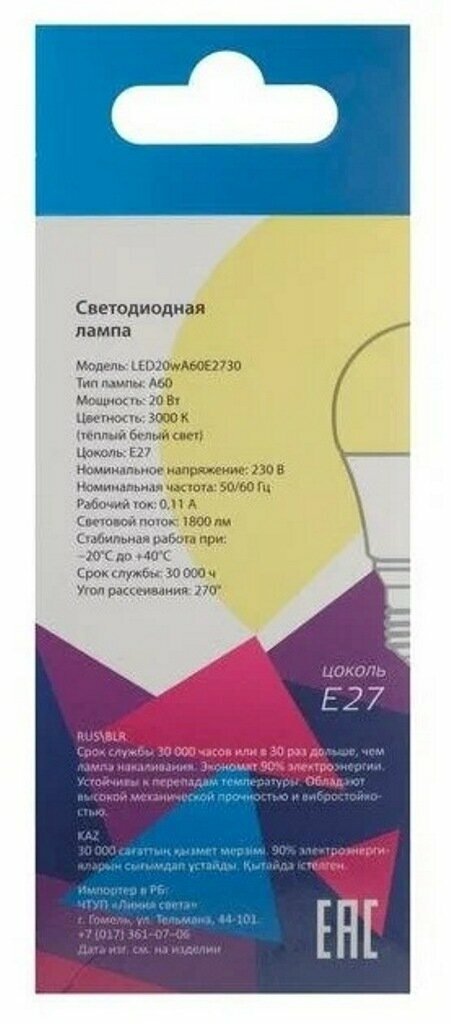 Купить Лампа светодиодная A60 20Вт 3000К E27 220В космос LkecLED20wA60E2730(3 штук.)