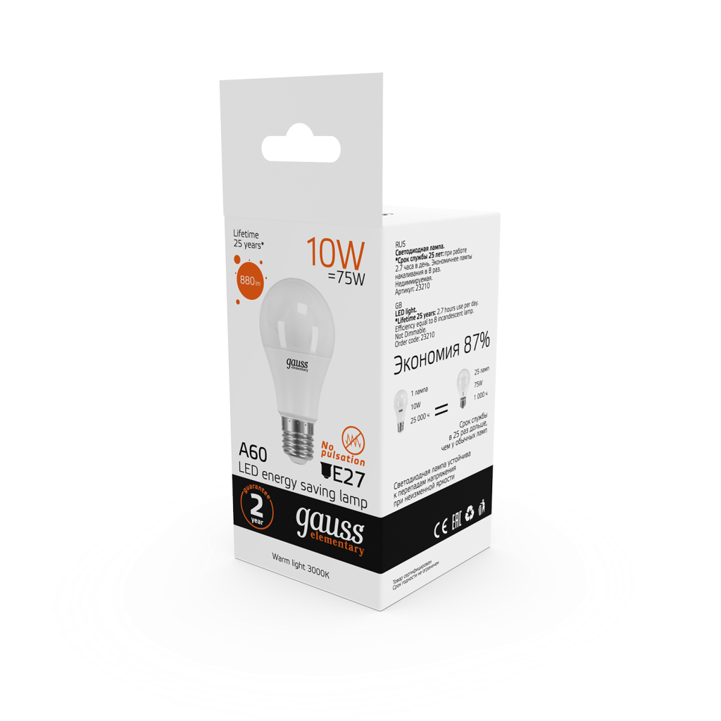 СохранитьЛампа светодиодная Elementary 10Вт A60 грушевидная 3000К тепл. бел. E27 880лм GAUSS 23210(3 штук.) интересное: