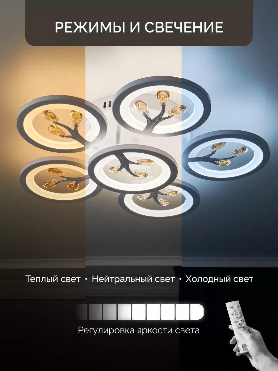 Управляемая люстра потолочная светодиодная с пультом 120 вт 30м² 3500-6500К на кухню, в гостиную