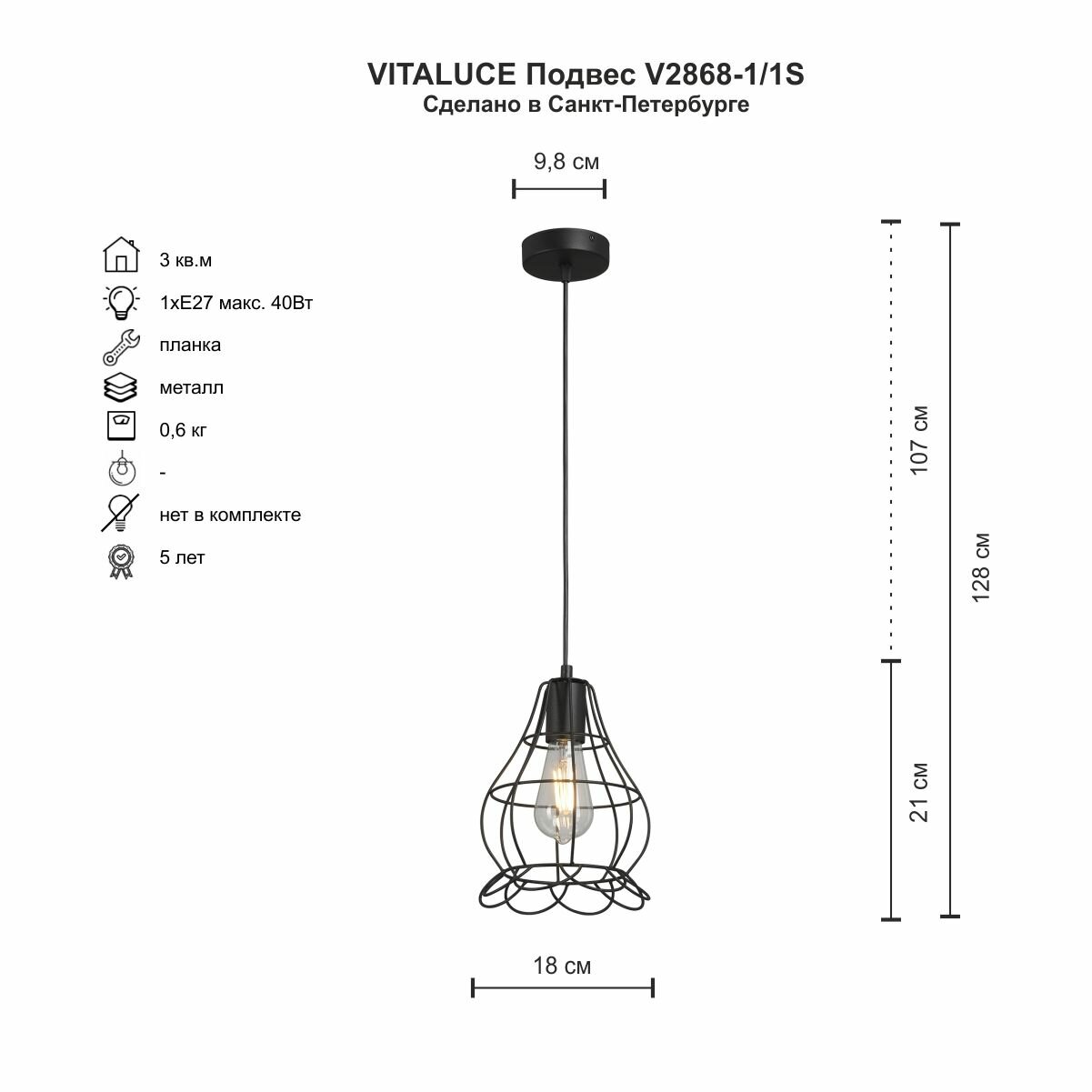Люстра подвесная Vitaluce V2868-1/1S, 1 лампа, E27 макс. 40Вт, 3 м2, цвет чёрный матовый. интересное: