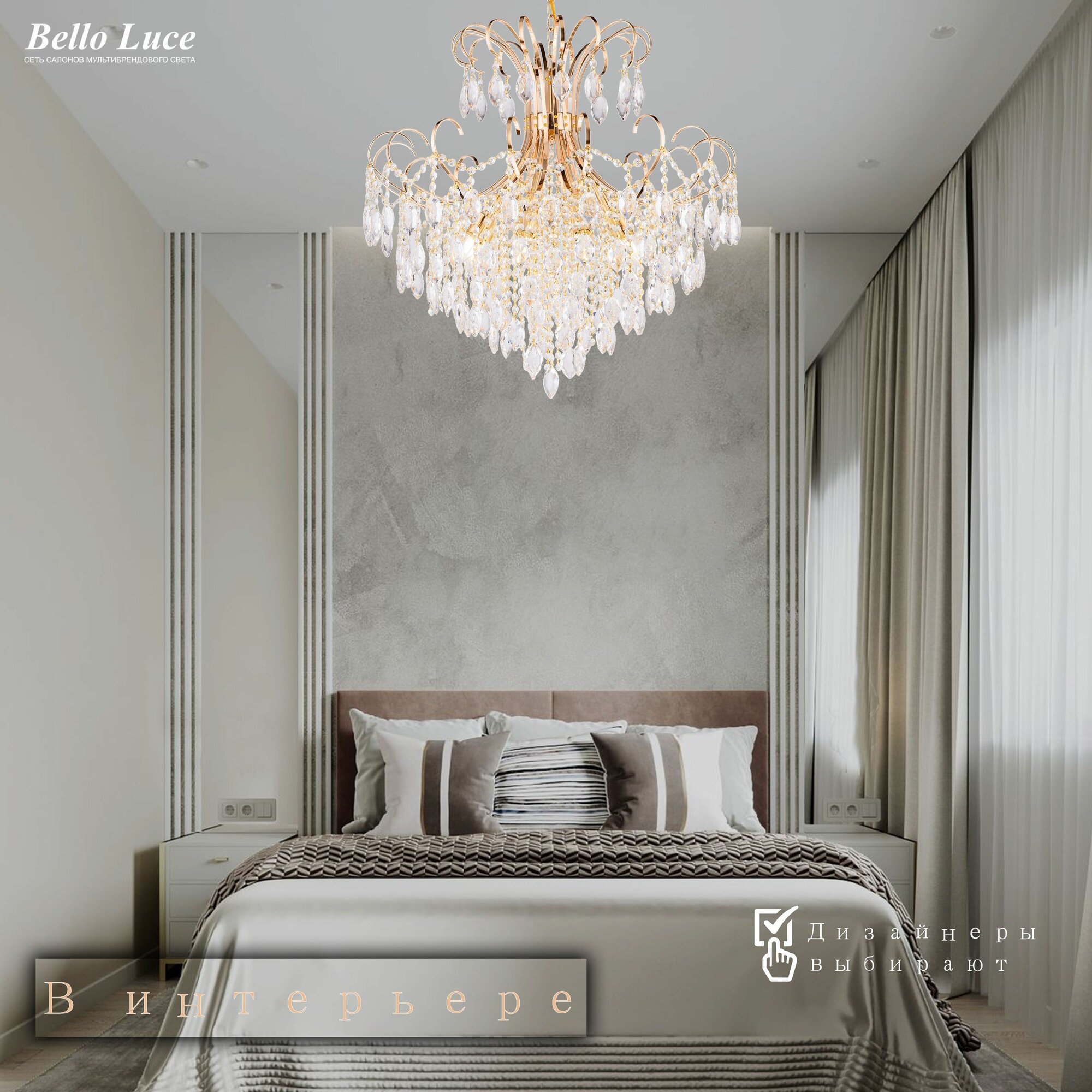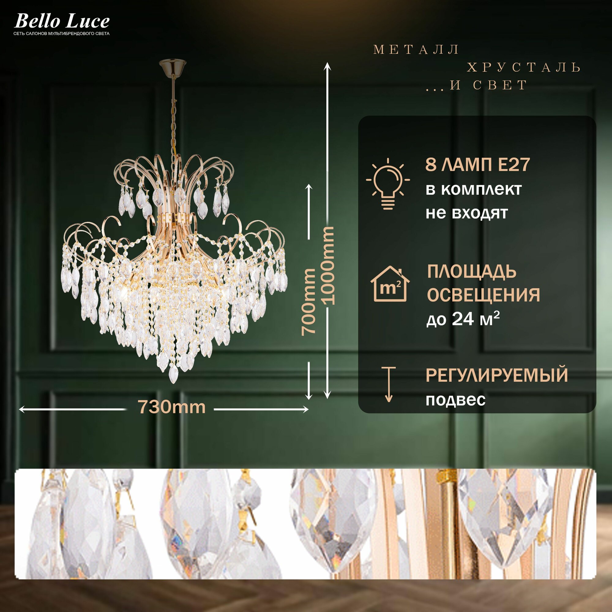 Люстра хрустальная золотая подвесная круглая с прозрачными хрустальными подвесками на 8 ламп E27, регулировка по высоте интересное: