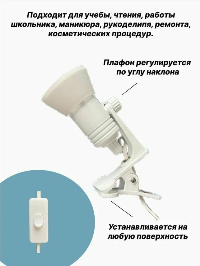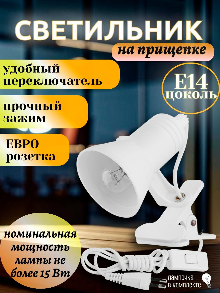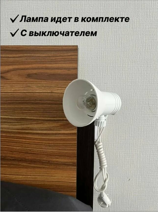 Светильник на прищепке с проходным выключателем на шнуре белый. Номинальная мощность лампы не более 15 Вт. интересное:
