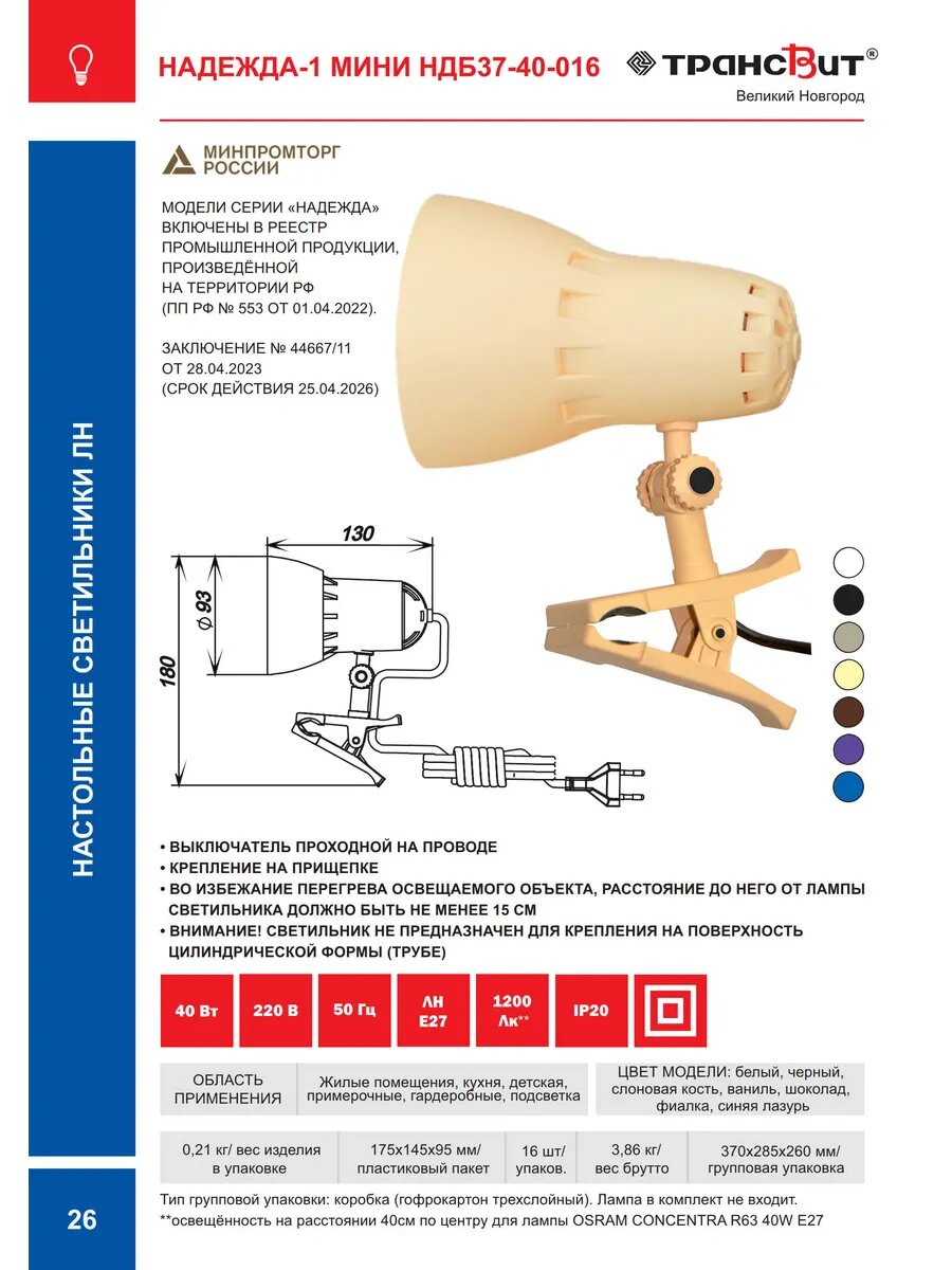 Настольный светильник Надежда 1- Мини Ндб37-40-016 синяя лазурь Трансвит 220В E27 на прищепке интересное: