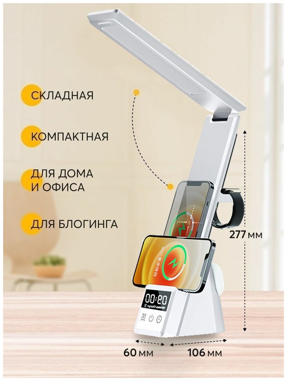 Настольная лампа светодиодная многофункциональная LED с будильником календарем беспроводной зарядкой часов интересное: