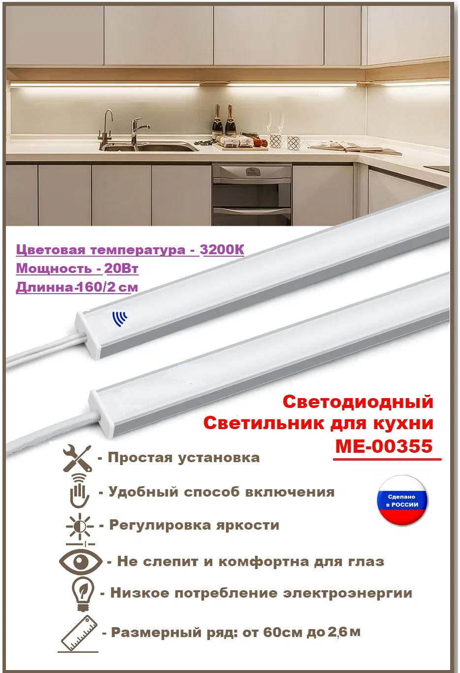 СохранитьСветодиодный светильник для кухни под навесные шкафы, с включателем от взмаха руки, 160см(из 2х частей 80см+80см), 3200К-теплый белый. интересное: