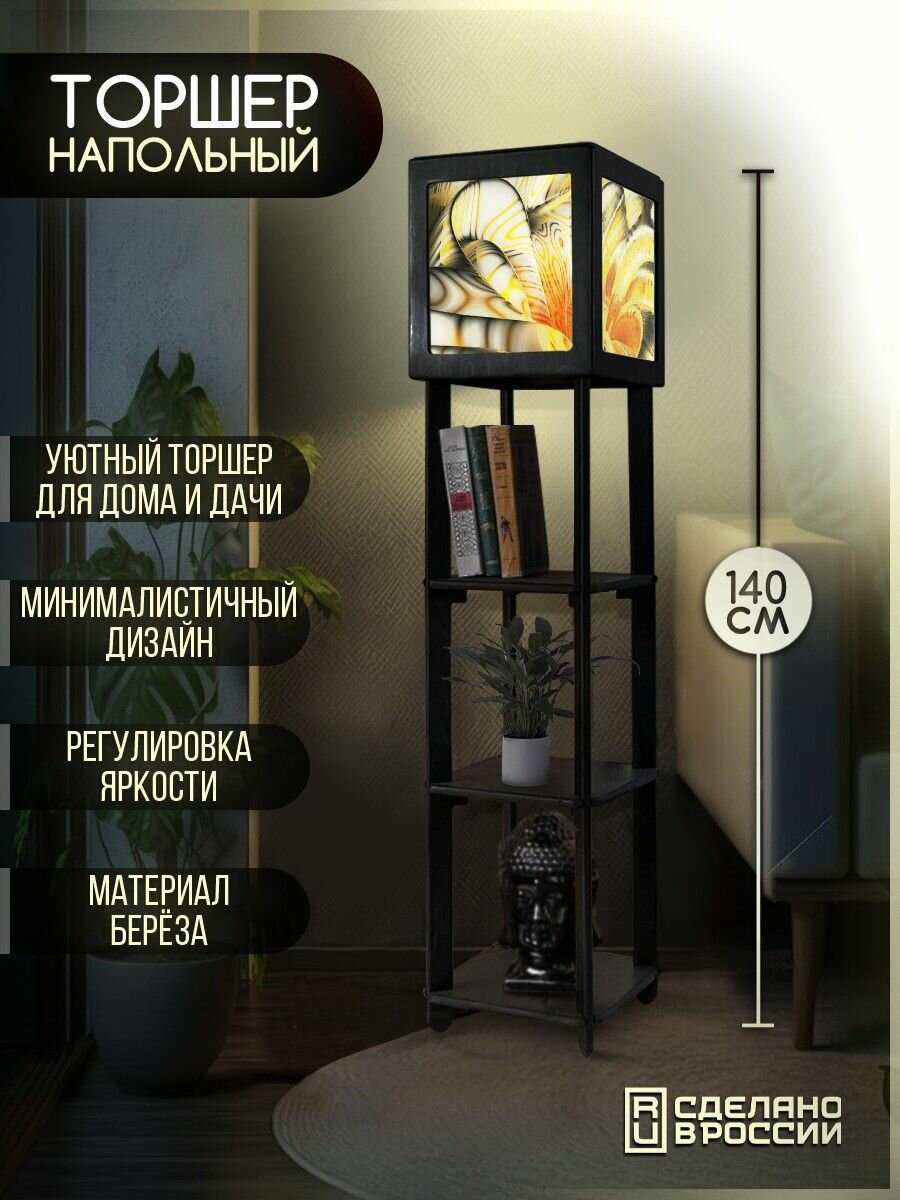 Напольная лампа с полками квадратная, напольный светильник с принтом абстракция (пейзаж, природа, птицы, море) - 540