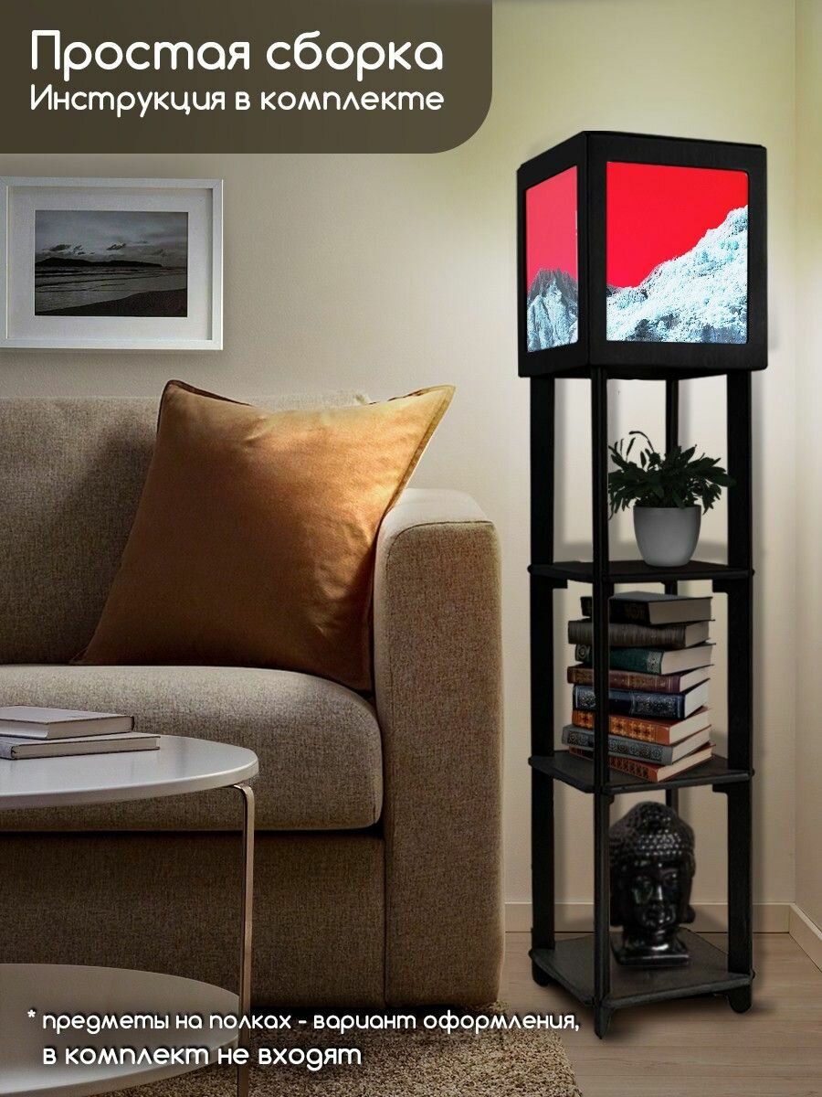 Напольная лампа с полками квадратная, напольный светильник с принтом абстракция (красный, черный, луна, солнце) - 565
