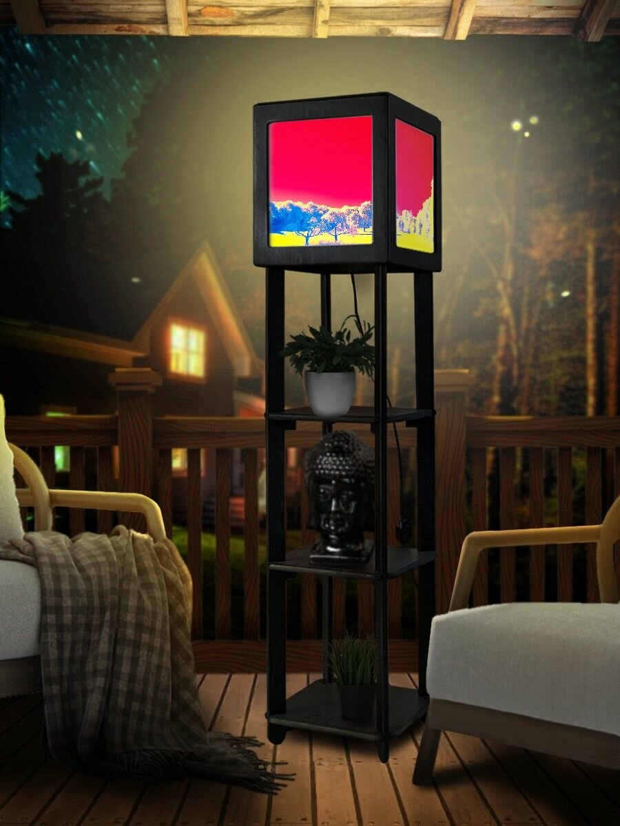 Напольная лампа с полками квадратная, напольный светильник с принтом абстракция (пейзаж, природа, птицы, море) - 540
