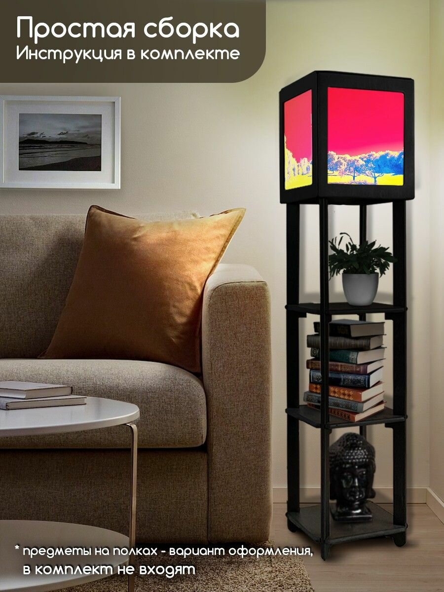 Напольная лампа с полками квадратная, напольный светильник с принтом абстракция (красный, черный, луна, солнце) - 565