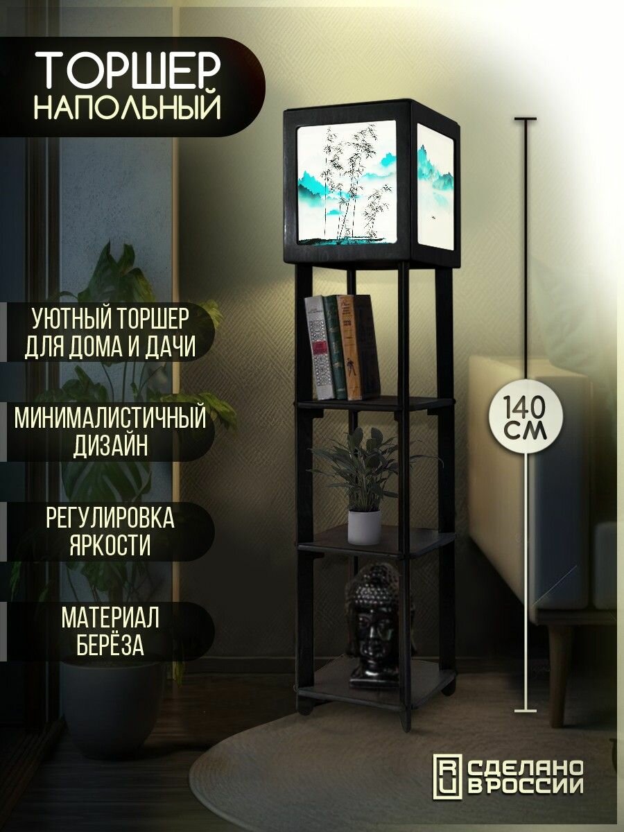 Купить Напольная лампа с полками квадратная, напольный светильник с принтом азия эстетика (япония, пейзаж, горы, река, бамбук) - 2024