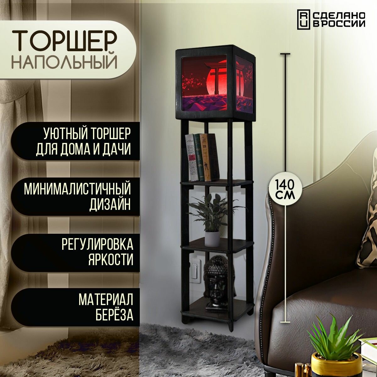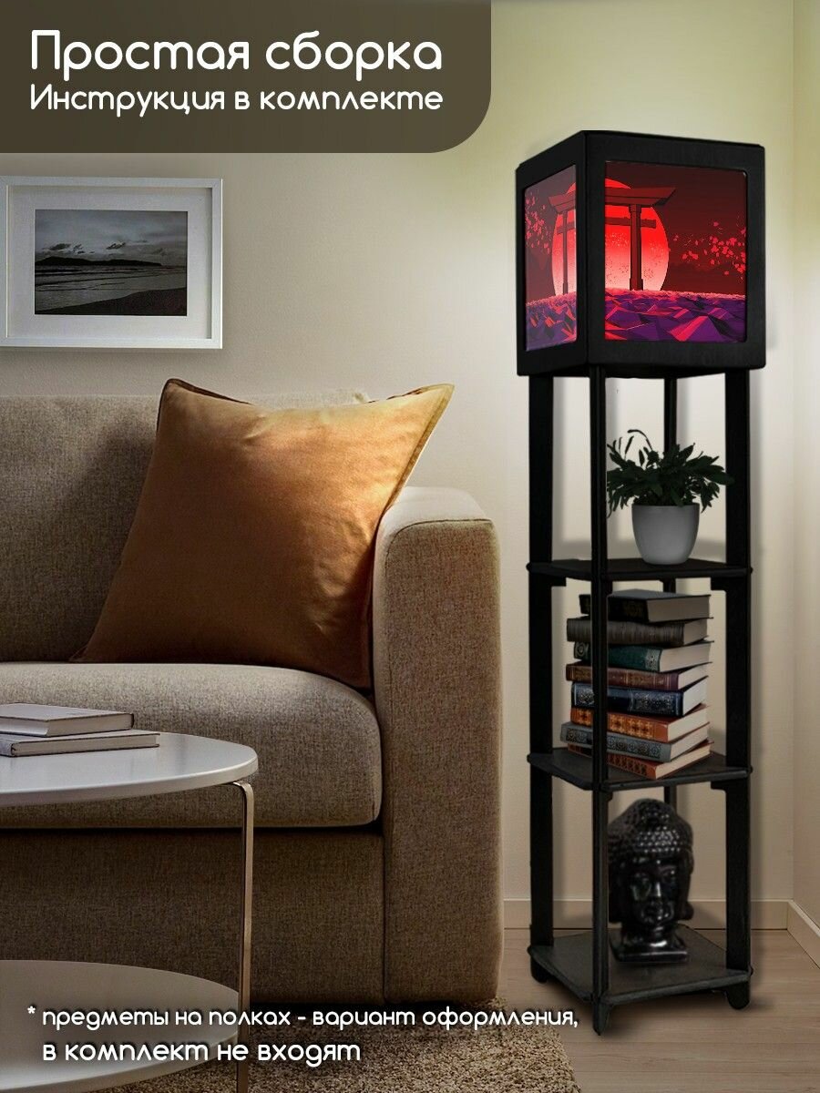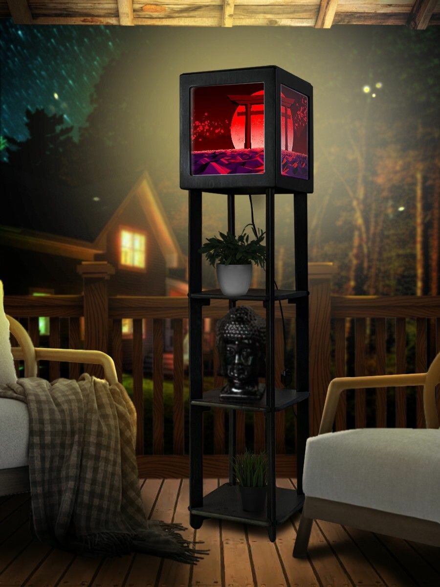 Купить Напольная лампа с полками квадратная, напольный светильник с принтом азия эстетика (япония, пейзаж, красное солнце, минимализм, горы) - 2032