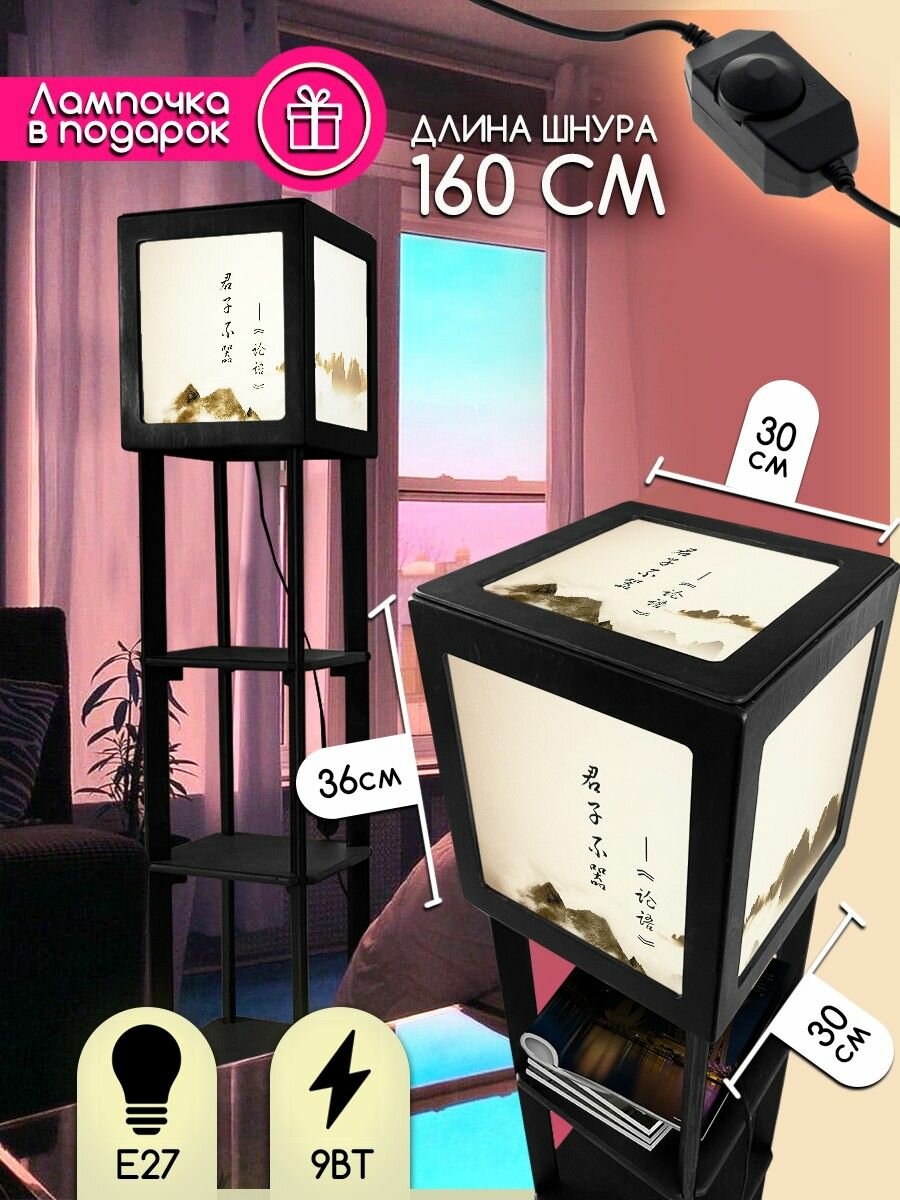 Купить Напольная лампа с полками квадратная, напольный светильник с принтом азия эстетика (япония, пейзаж, горы, иероглифы) - 2022