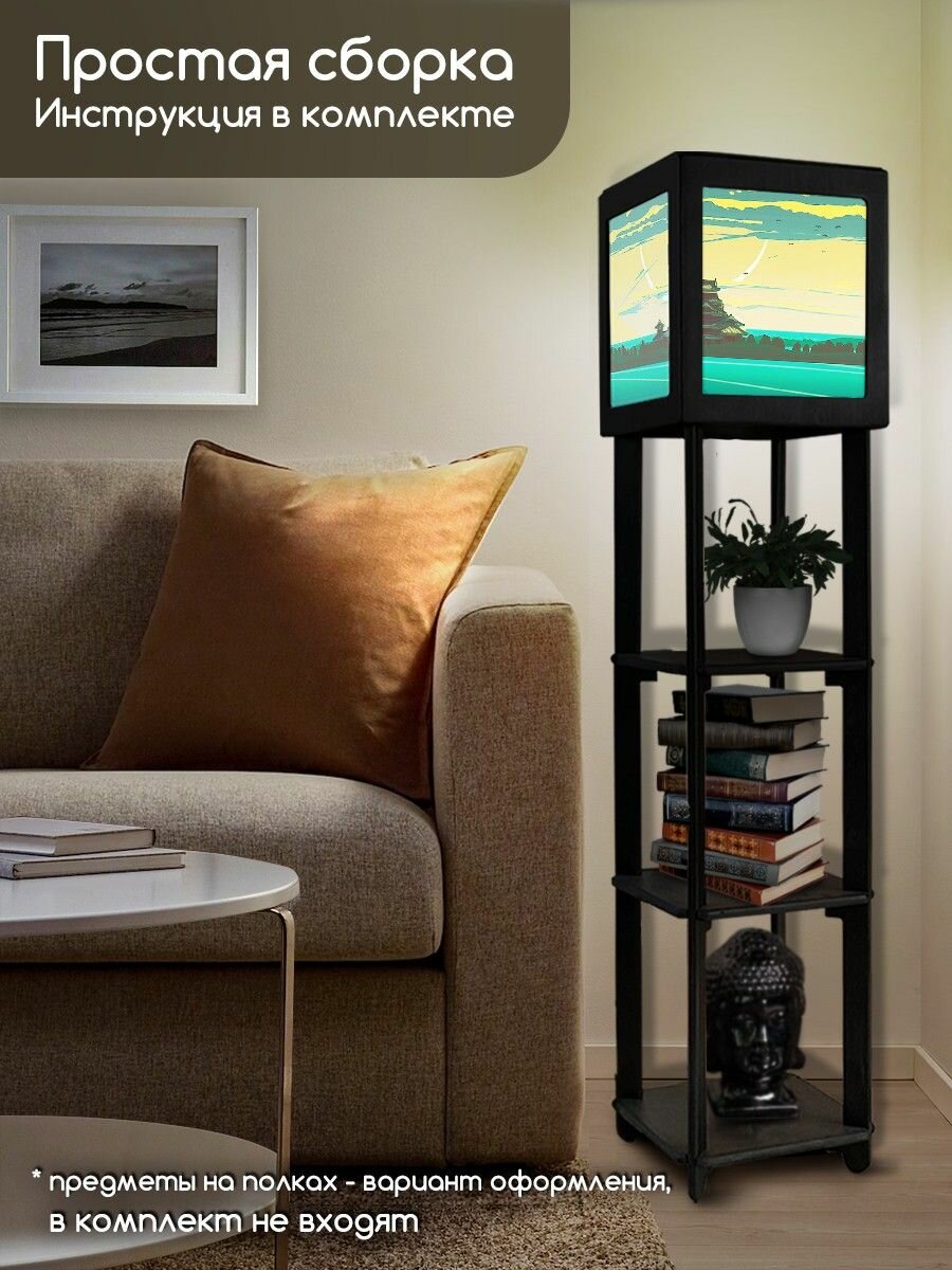 Купить Напольная лампа с полками квадратная, напольный светильник с принтом азия эстетика (япония, пейзаж, горы, храм, море) - 2035