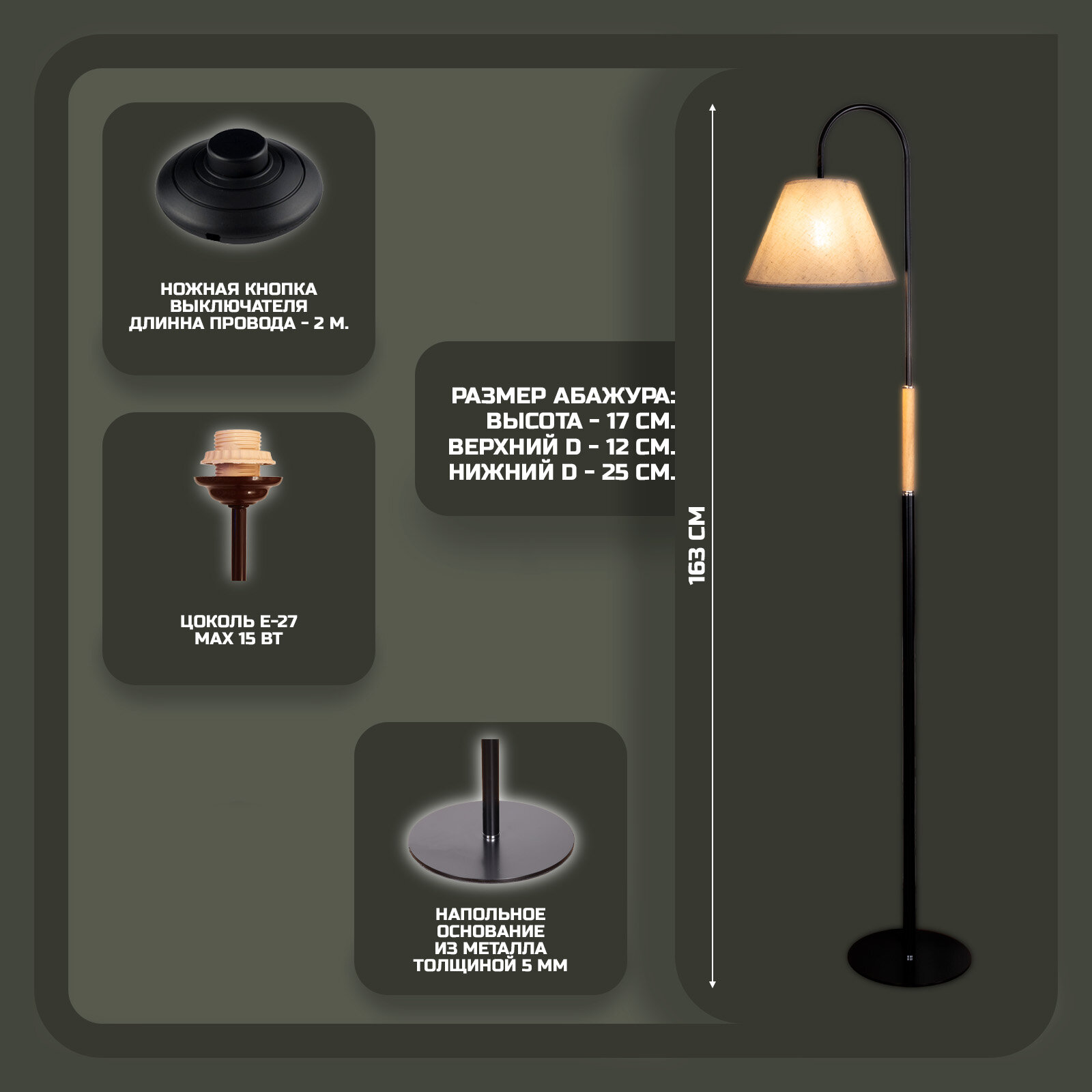 Напольный светильник, торшер. Черный/натурал. MA-1303PD-BK+AB-N-17, E27, 15 Вт. интересное: