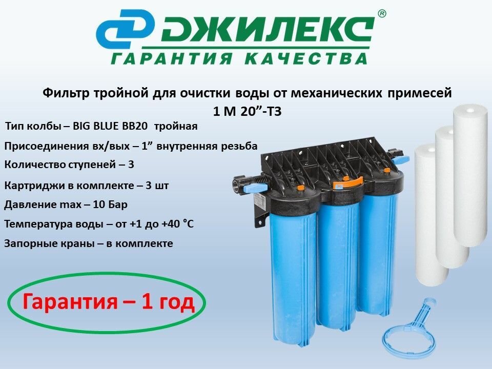 Фильтр для очистки воды от механических загрязнений тройной 1M 20" T3 (три ступени очистки, размер BIG BLUE 20", три картриджа в комплекте) интересное: