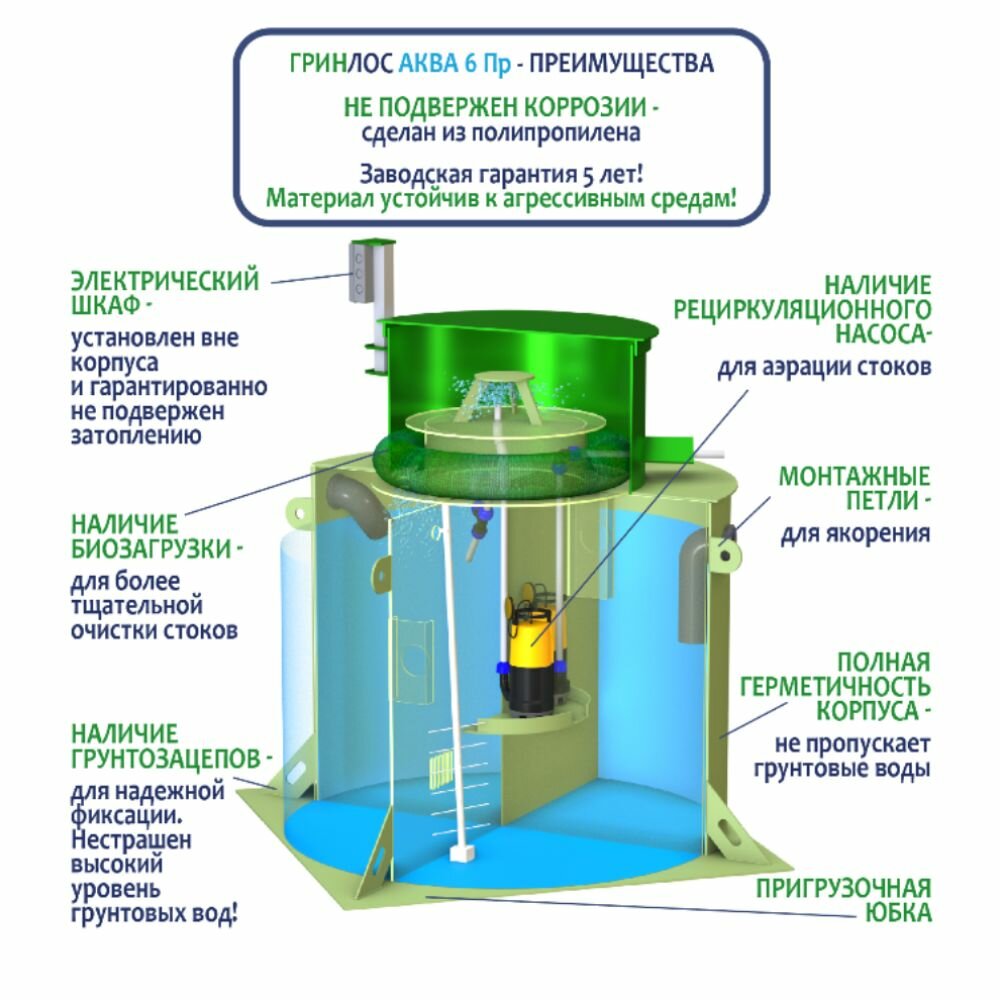 Автономная канализация, станция очистки гринлос Аква 6 с принудительным сбросом воды интересное: