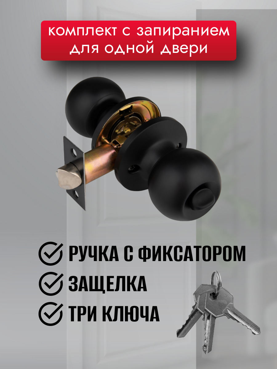 Ручка дверная межкомнатная кноб с защелкой, фиксатор без ключей , черная, комплект 607 BLACK BK