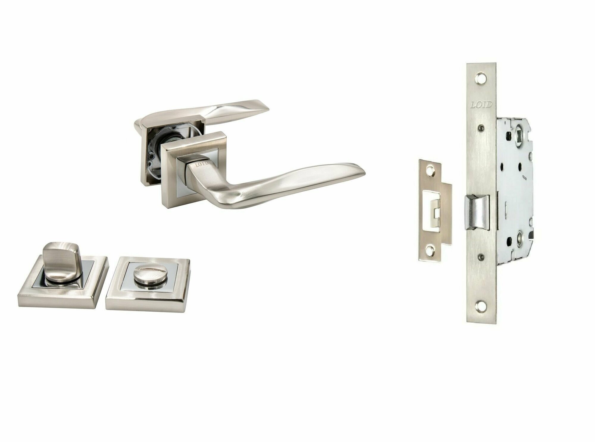 Ручка дверная межкомнатная, поворотная, нажимная Loid 350 SN + замок M-2055 B SN + завертка квадратная SN/CP матовый хром