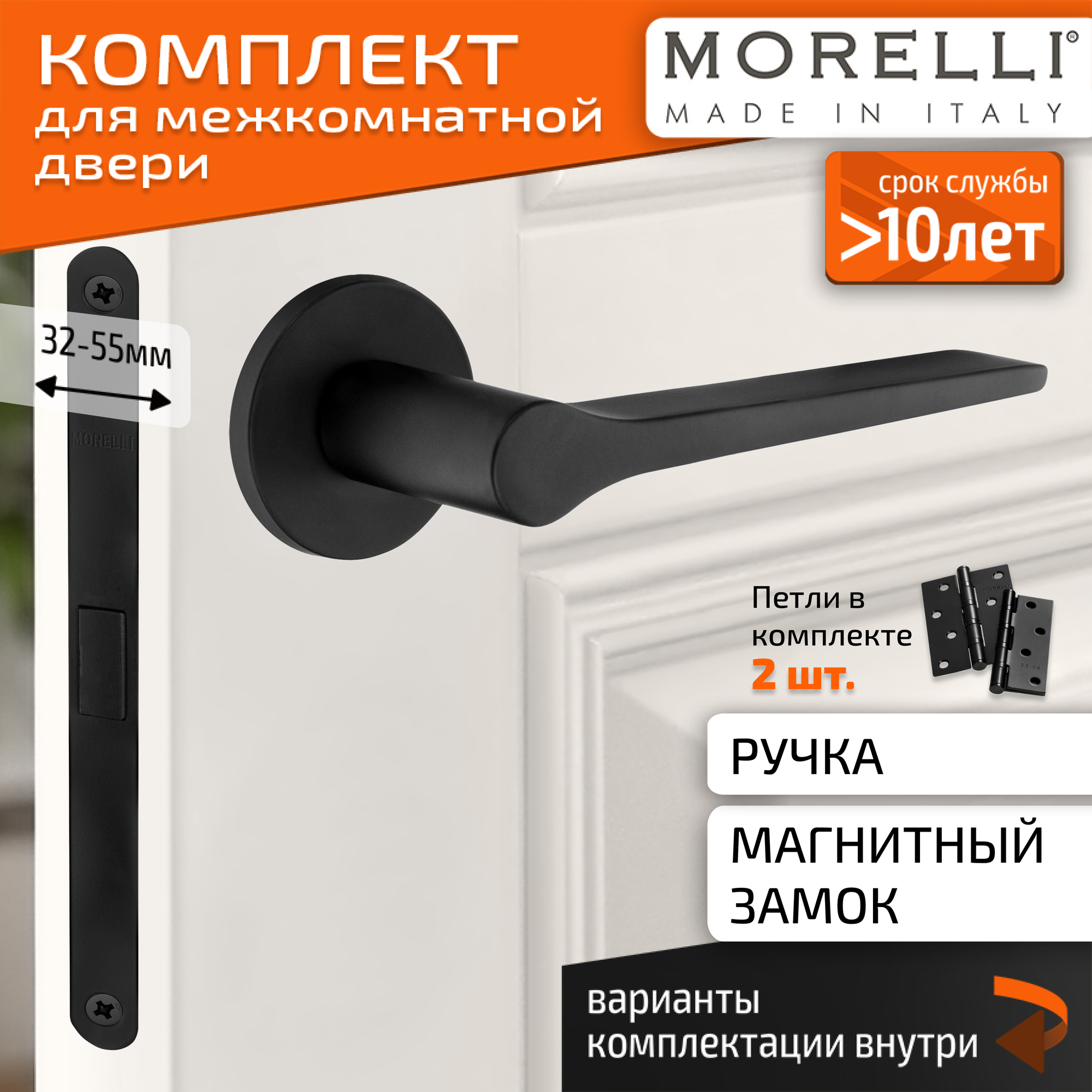 Комплект для межкомнатной двери Morelli / Дверная ручка MH 60 R6 BL + бесшумный замок + врезные петли / черный матовый