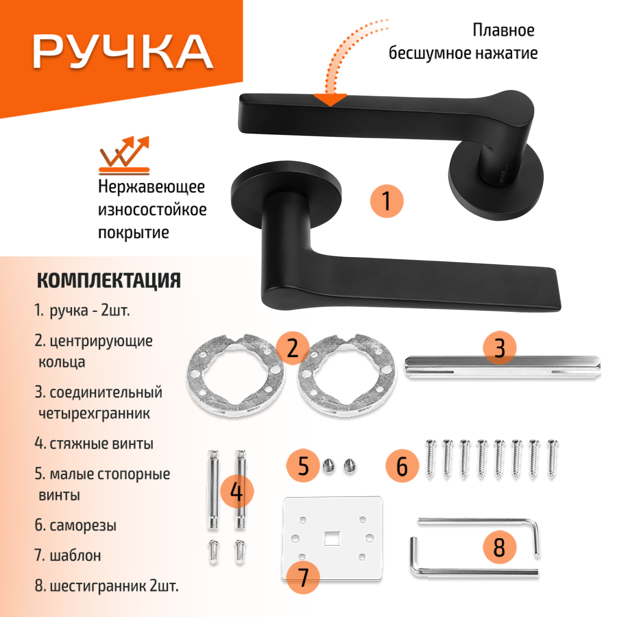 Комплект для межкомнатной двери Morelli / Дверная ручка MH 60 R6 BL + бесшумный замок + врезные петли / черный матовый