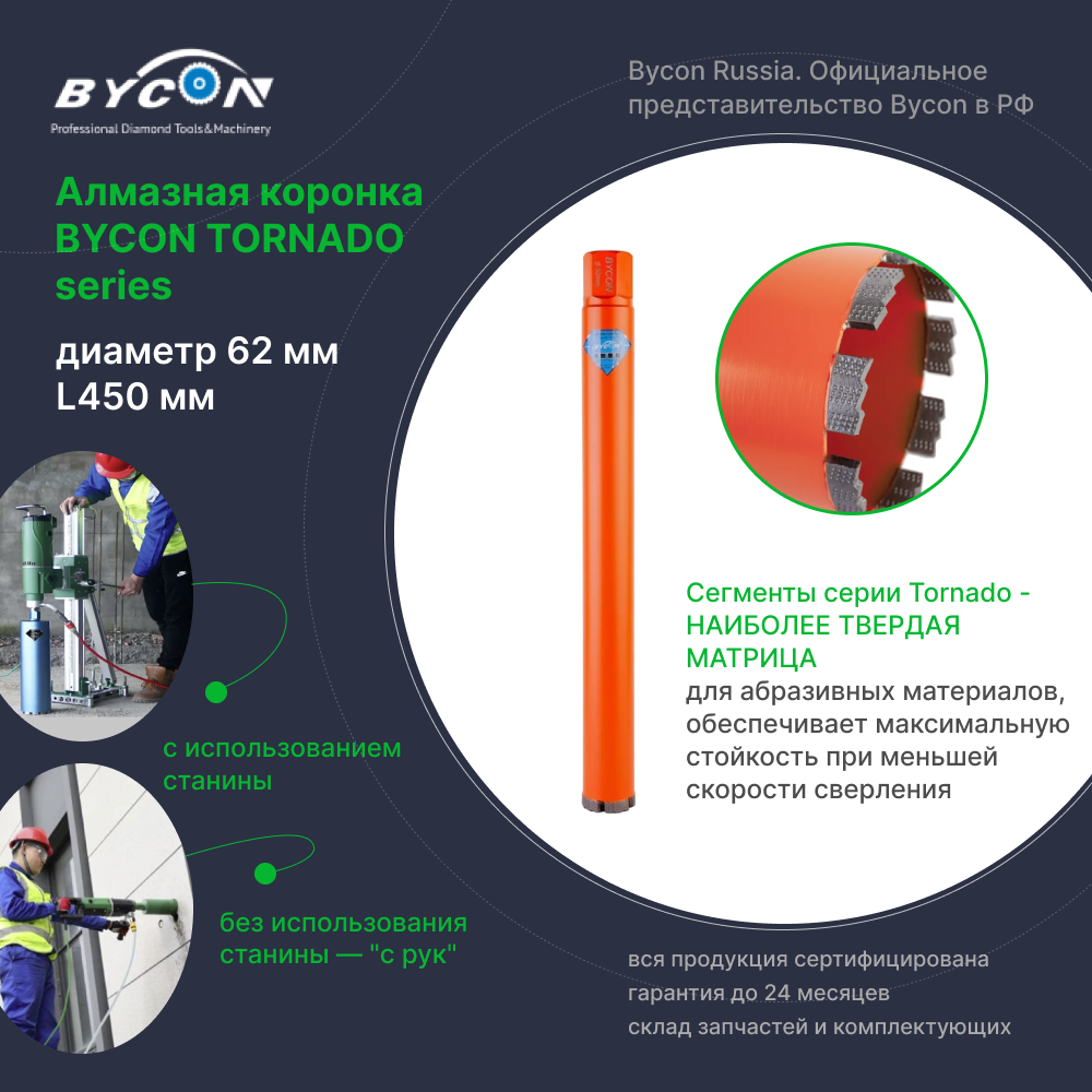 СохранитьBYCON Коронка алмазная 62 х 450 мм TORNADO по бетону, кирпичу, железобетону для сухого и мокрого сверления интересное: