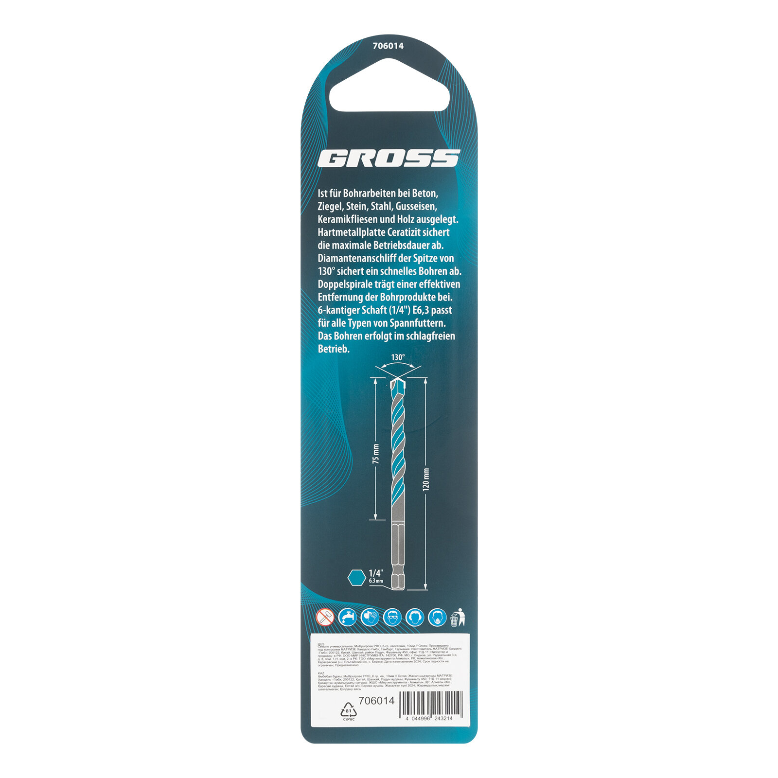 Сверло универсальное Gross Multipurpose PRO, 6 мм, по дереву, металлу, бетону и плитке, ВК8, 6-гранный хвостовик, 706012