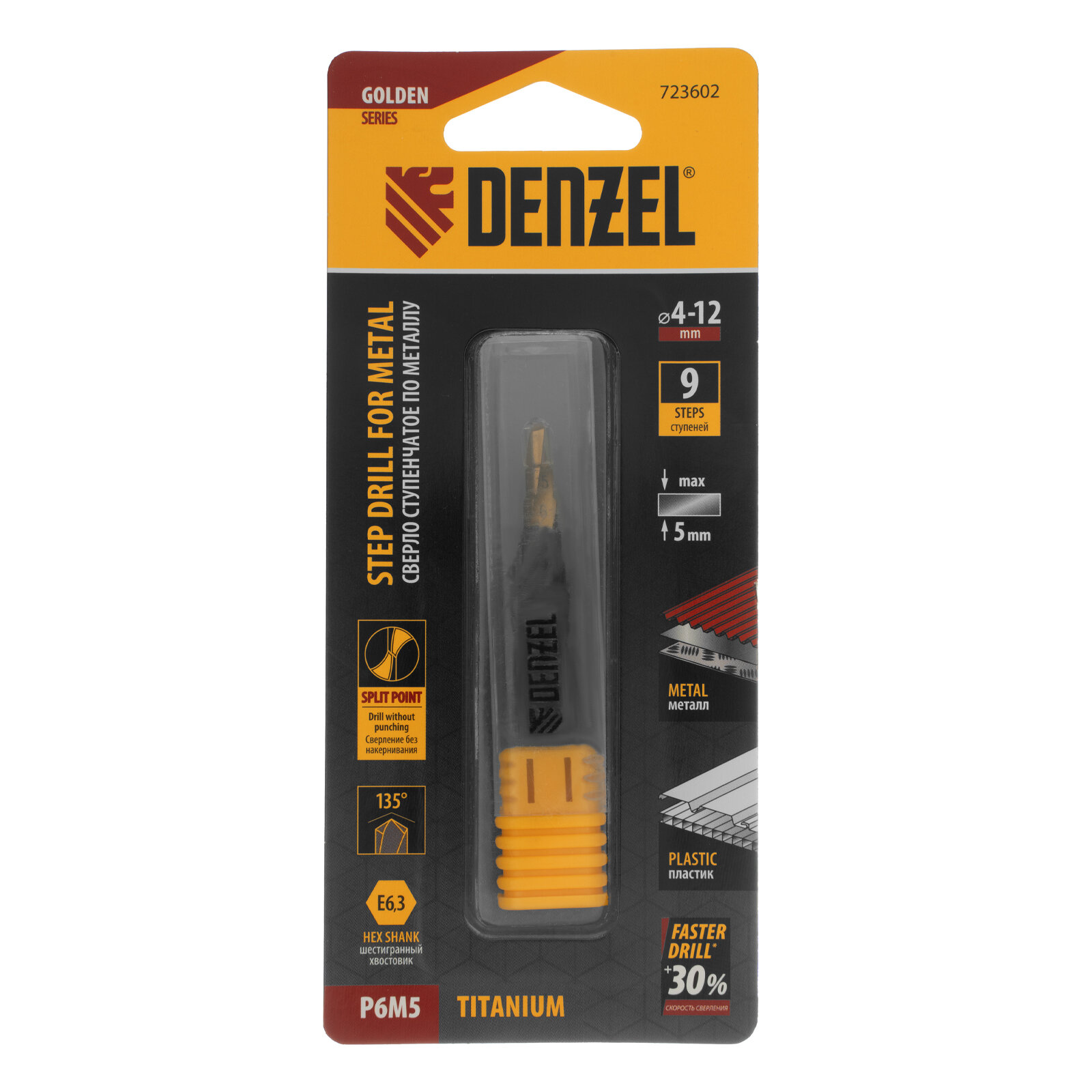 Купить Сверло ступенчатое Denzel 4-5-6-7-8-9-10-11-12 мм, Р6М5, 6-гр. хвостовик 723602