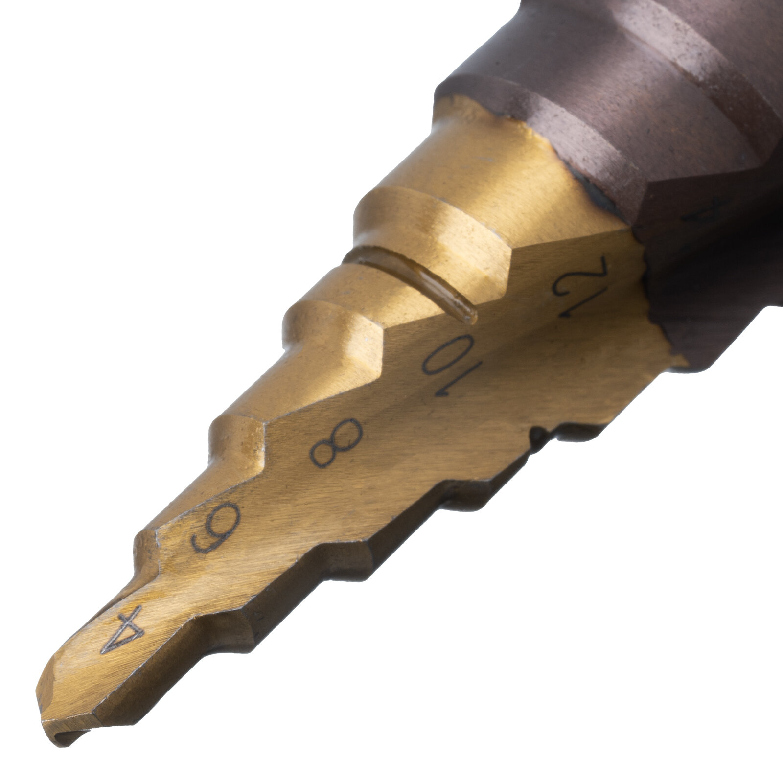 Сверло ступенчатое Denzel 4-5-6-7-8-9-10-11-12 мм, Р6М5К5, 6-гр. хвостовик 723612