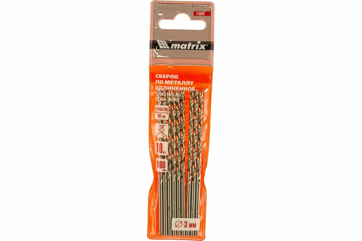 Купить Сверло по металлу Matrix удлиненное, 3 х 100 мм, 10 штук, цилиндрический хвостовик, сталь HSS, полированное, 715030