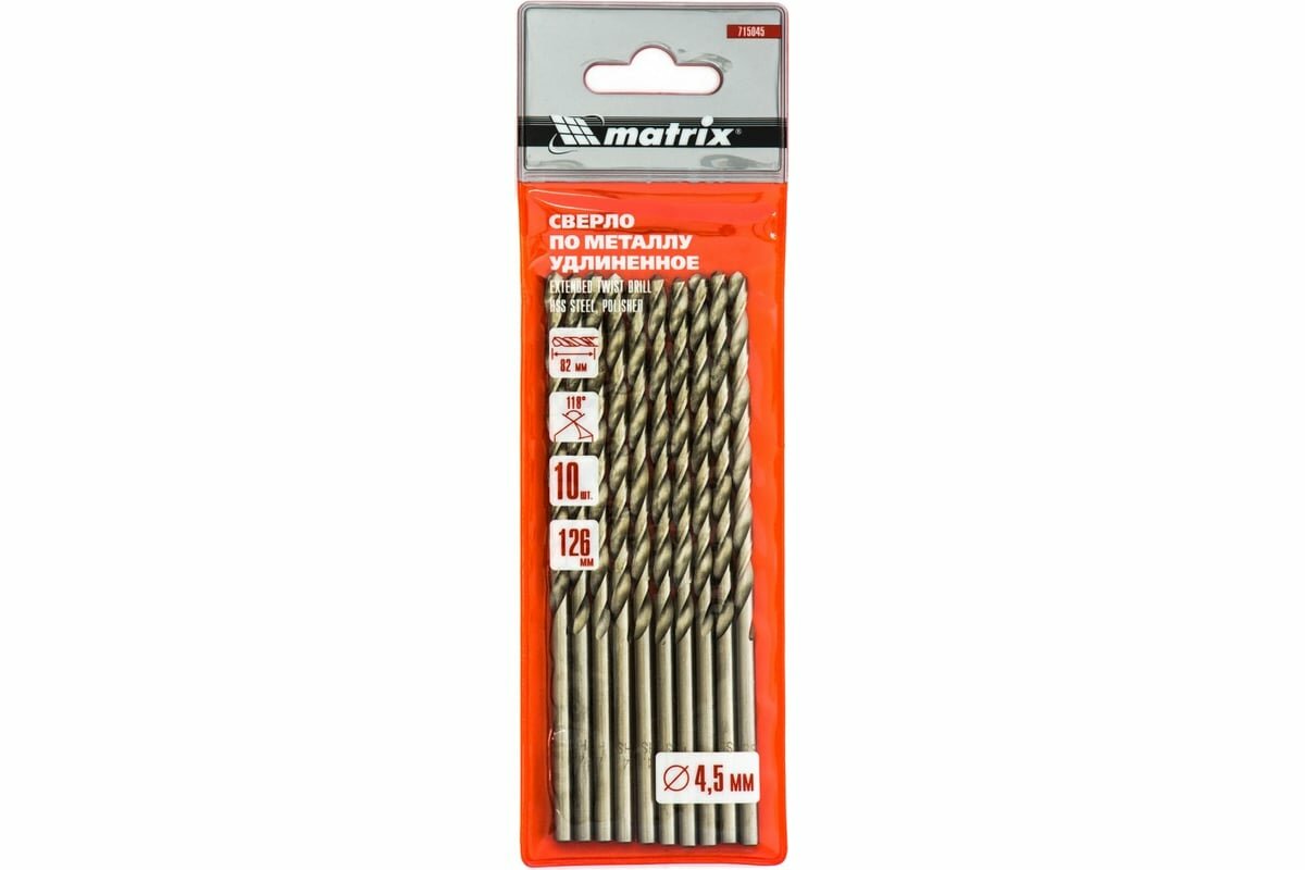 Сверло по металлу Matrix удлиненное, 4.5 х 126 мм, 10 штук, цилиндрический хвостовик, сталь HSS, полированное, 715045 интересное: