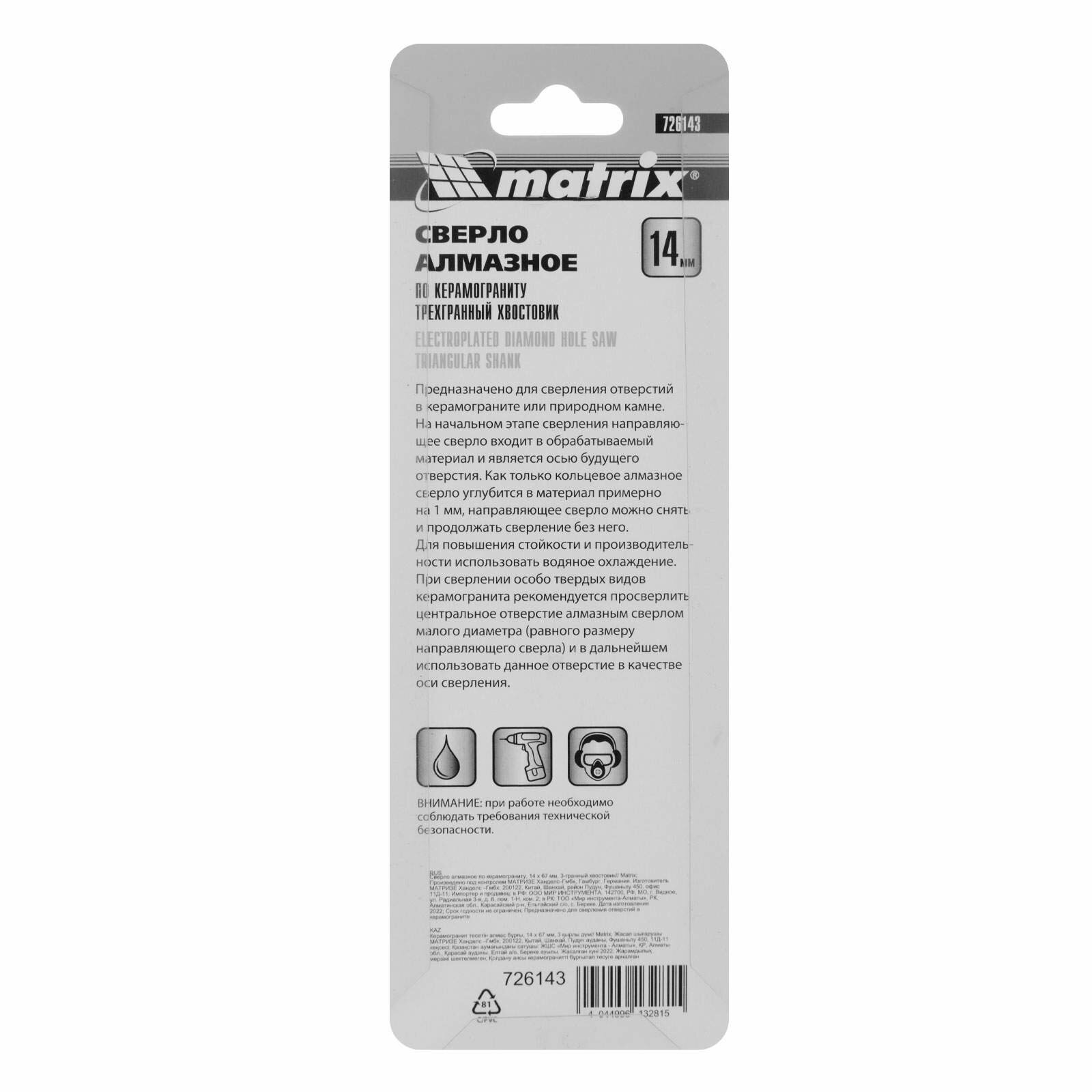 Сверло алмазное по керамограниту Matrix 14 х 67 мм, 3-гранный хвостовик 726143 интересное: