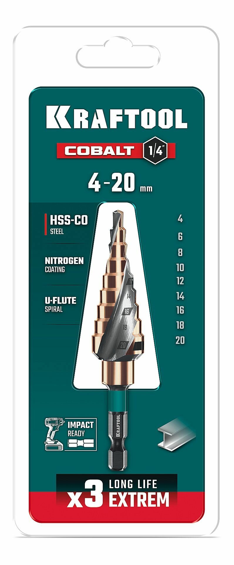 Сверло ступенчатое KRAFTOOL Cobalt 4-20мм, 9 ступеней 29691-4-20-9