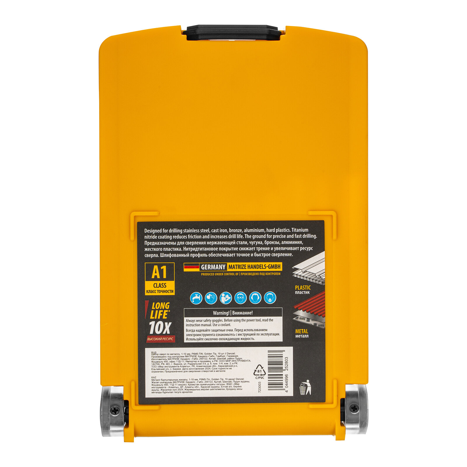Сверла по металлу Denzel Golden Tip, 1-10 мм, 10 штук, сталь Р6М5-TiN, цилиндрические и 3-гранные хвостовики, 723001